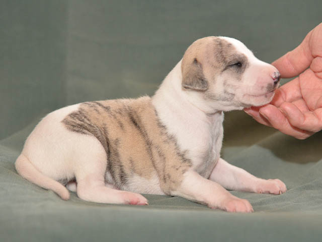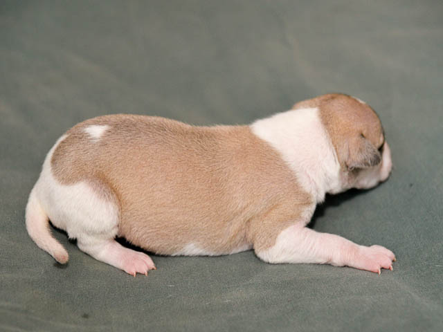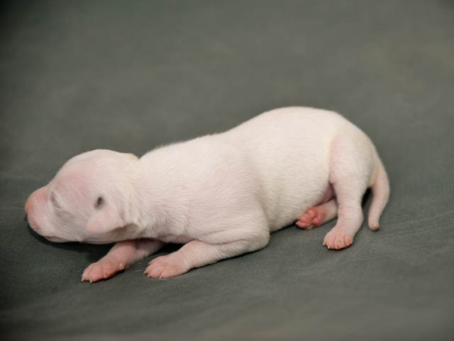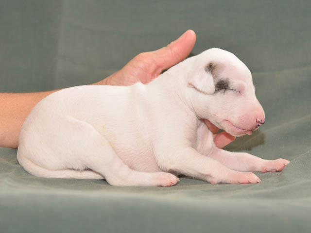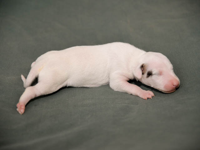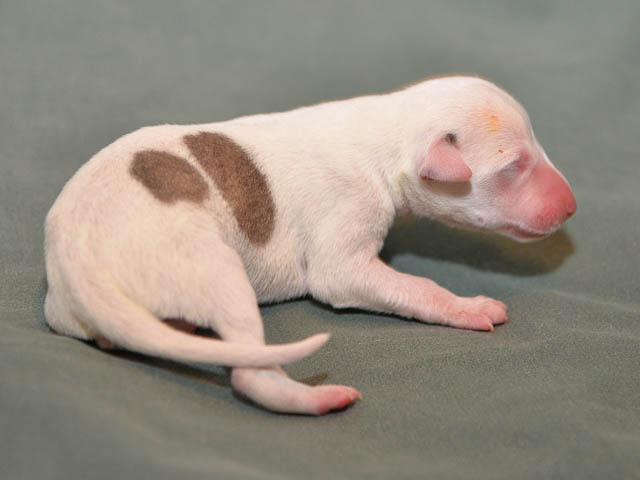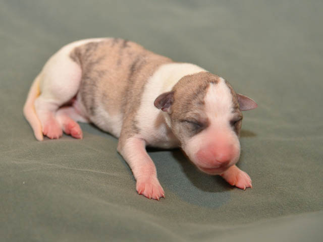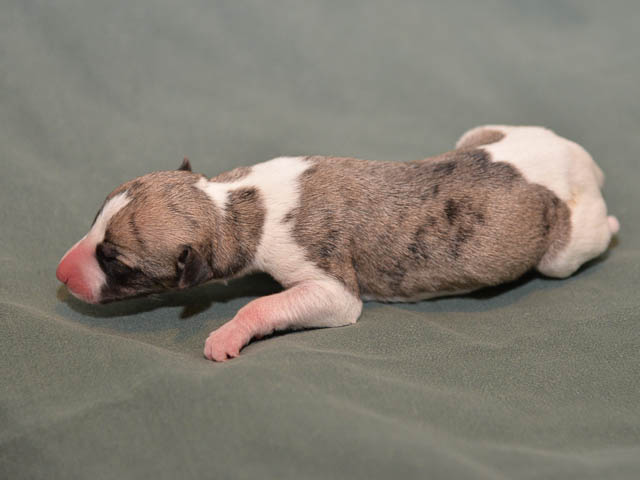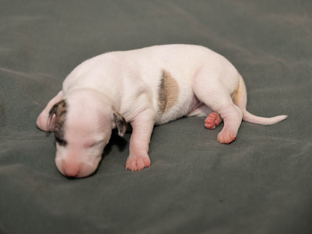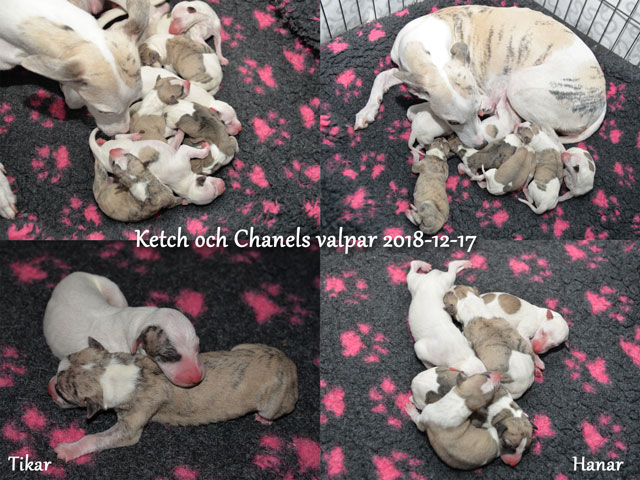2018-12-17 Ketch och Chanels valpar är här! I natt födde Chanel 7 valpar – 5 hanar och 2 tikar. Chanel födde snabbt sina valpar utan problem. Första valpen kom kl. 02.00 och sista valpen kl. 05.00, så det blev nattarbete för matte och husse. En hane är helt vit förutom vid öron där han har två svarta prickar. En hane är nästen helt vit, men har rödbrindle fläckar på ena sidan. En hane är beige och vit och två är brindle och vit. Den ena tik är nästan helt vit och den andra är rödbrindle. Alla valparna diar som de ska och har fått den viktiga råmjölken. Chanel och valparna mår bra.