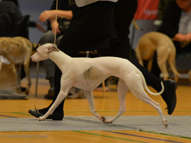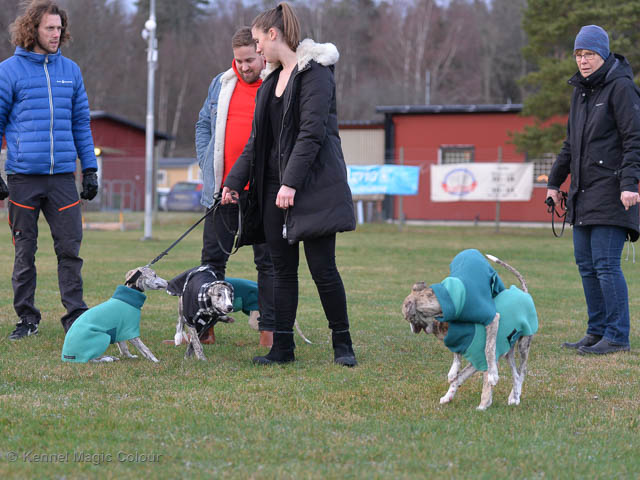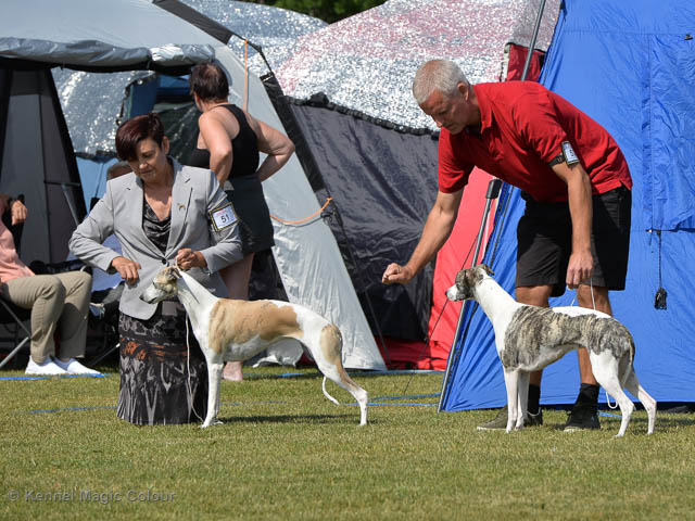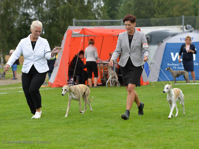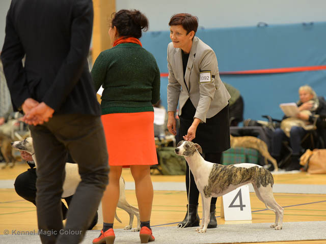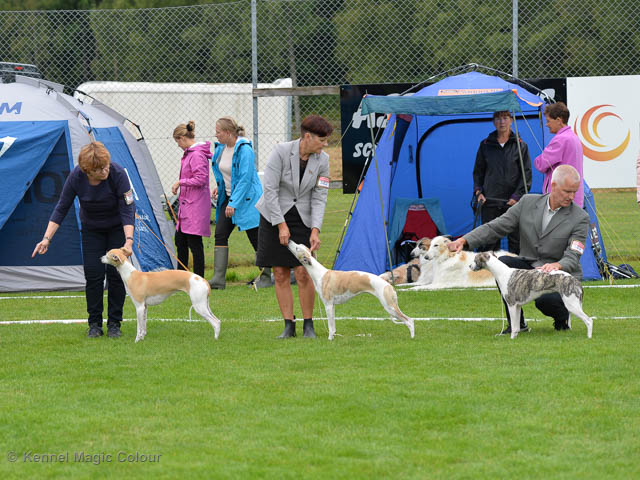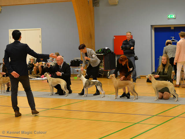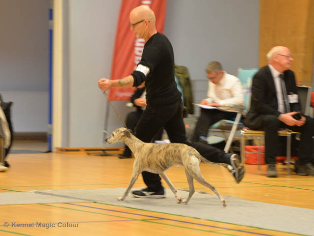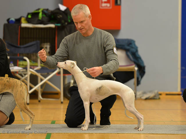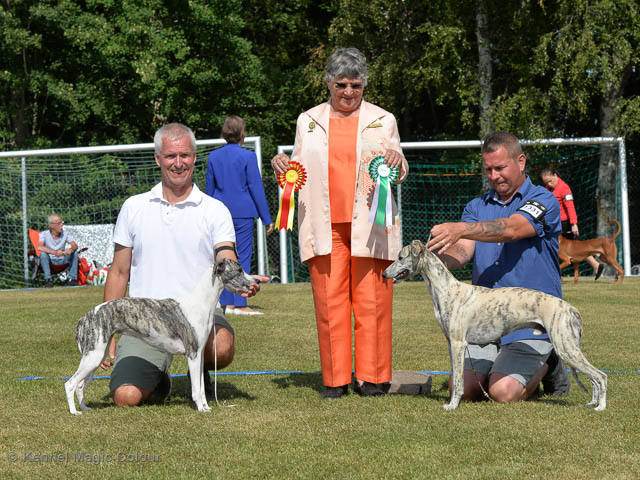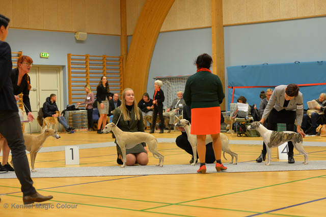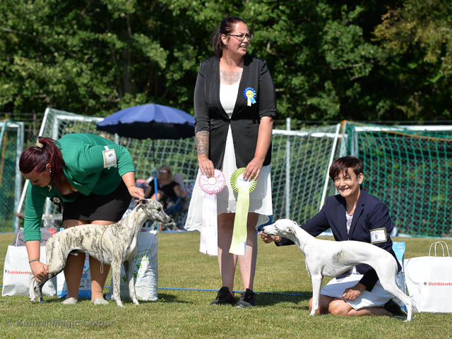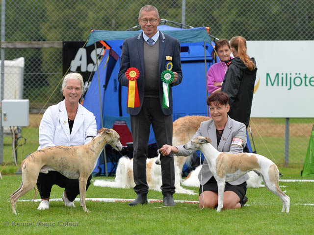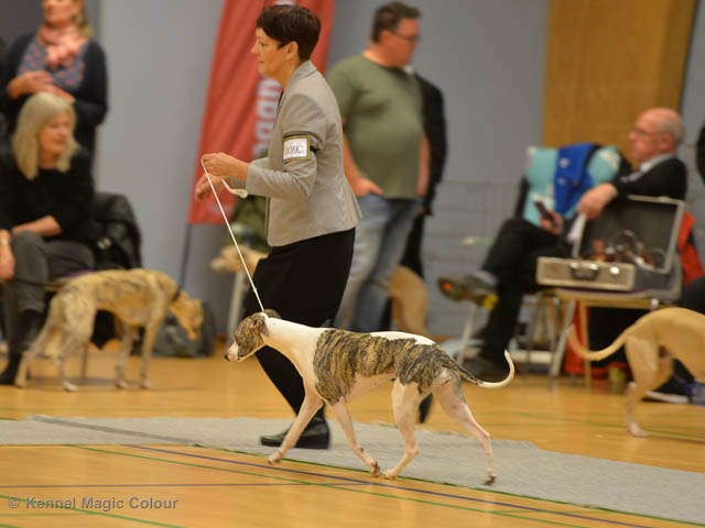 2019-06-09 NDS i Märsta Idag har vi varit på SKK:s utställning i Märsta. Totalt var det anmäld 33 whippets och domare var Jussi Liimatainen från Finland. Fån MC deltog Cosmo - Magic Colour Sporting Streak, Viking – KLBJCH Magic Colour Captain Tyler, Imse – SECH Magic Colour Cyber Cowboy, Candy – DKJUCH KLBJCH Magic Colour Sugar Candy, Scarlet – Magic Colour Scarlet Tyler, Indi – Magic Colour Lightning Streak och Chanel – SECH DKCH KLBCH Magic Colour Cosmo Chanel. Chanel debutera med sin avelsklass bestående av Viking, Scarlet, Cosmo och Indi. Vi blir BIR avelsklass med HP och slutar som BIS3 avelsklass Vi blir också BIR Uppfödargrupp med HP utav tre uppfödargrupper. Vår grupp bestod av 4 kombinationer Imse, Cosmo, Scarlet och Candy. Som alltid hade vi det trevlig. Vädret var soligt och mycket blåsande under bedömning. Då vi skulle till förbedömning i finalen började det att regna och alla blev mycket blöta. Solen kom tillbaka då vi var i finalen. Stort tack till er alla som så tappert stod ut med det dåliga vädret. Det betyder mycket för oss att få möjlighet att visa så fina grupper. Deltagande hundars resultatMagic Colour Sugar Candy (Candy) EXC-2 CQMagic Colour Captain Tyler (Viking) EXC-2Magic Colour Cyber Cowboy (Imse) EXC-2 CQMagic Colour Scarlet Tyler (Scarlet) EXC-2 CQMagic Colour Lightning Streak (Indi) VG-4Magic Colour Sporting Streak (Cosmo) EXC-2Avelsgrupp/Progeny group BIR BIS-2Uppfödergrupp/Breeder group BIR Team Magic Colour Cosmo Viking Imse Indi Candy Scarlet