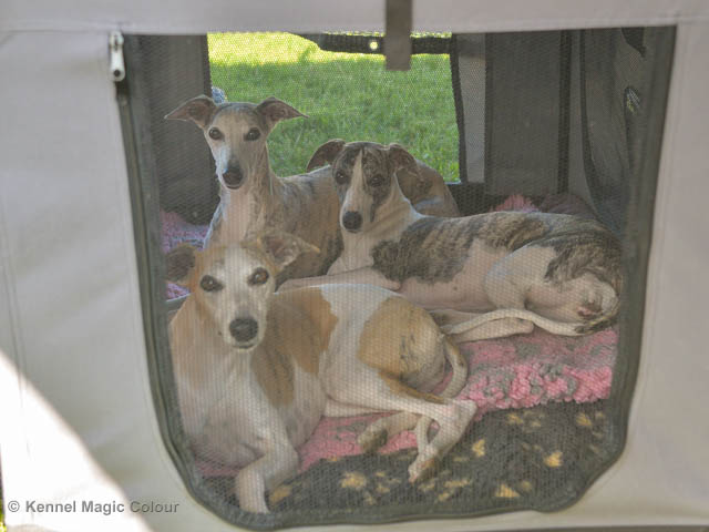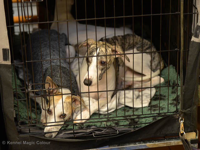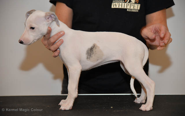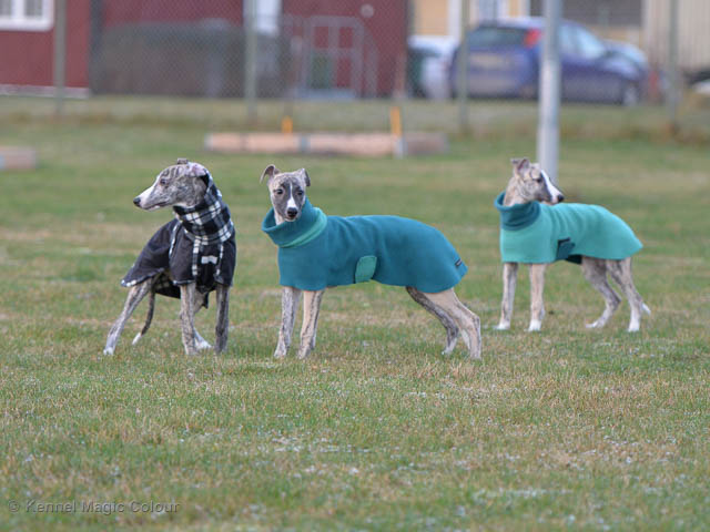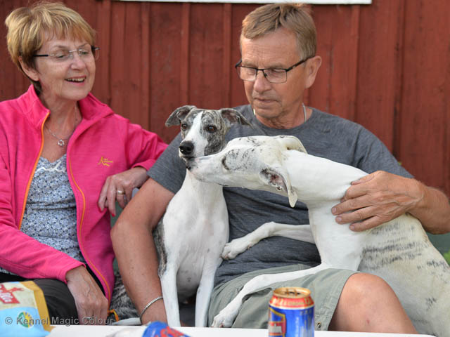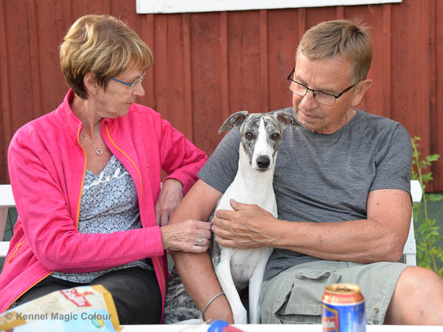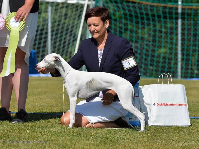 2019-07-13 NDS i Tvååker Idag har vi varit på NDS i Tvååker. Totalt var det anmäld 90 whippet. Domar på valpar var Bengt-Åke Bogren och på vuxna var det Wim Wiersma, Holland. Vi hade med oss Bella – Magic Colour Blond Sail, Candy - DKJUCH KLBJCh Magic Colour Sugar Candy och Scarlet – Magic Colour Scarlet Tyler. Det var Bellas debut på utställning och det var 4 tikar i klassen. Vi hade inte hunnit träna så mycket utställning, så mest var Bella med för träning. Stor var glädjen, då domaren tyckte om vår Bella. Bella vann valpklassen med HP och blev BIR valp. I stora ring var hon bland de som blev plockat ut i första gallringen bland mera än 40 valpar. Vi var mycket nöjda med dagens resultat. Deltagande hundars resultatMagic Colour Sugar Candy (Candy) EXC-3 CKMagic Colour Blond Sail (Bella) HP-1 BIRMagic Colour Scarlet Tyler (Scarlet) EXC Bella Candy Scarlet