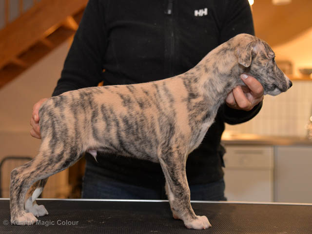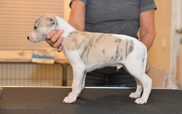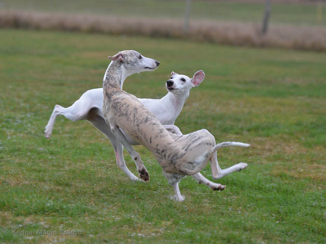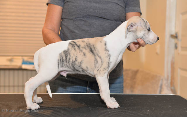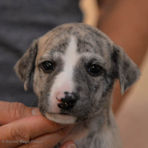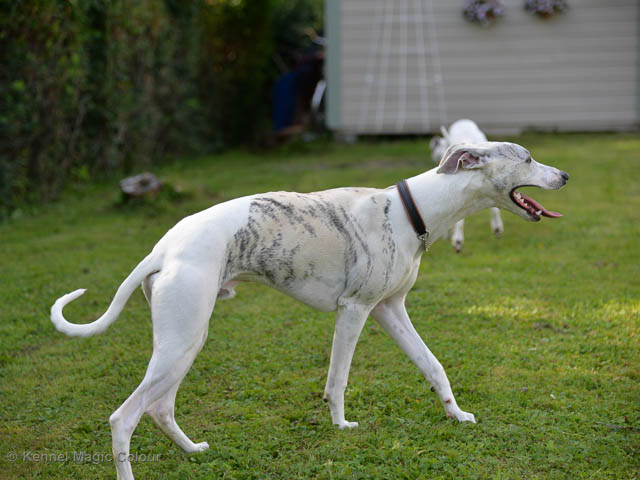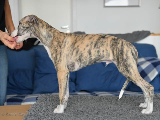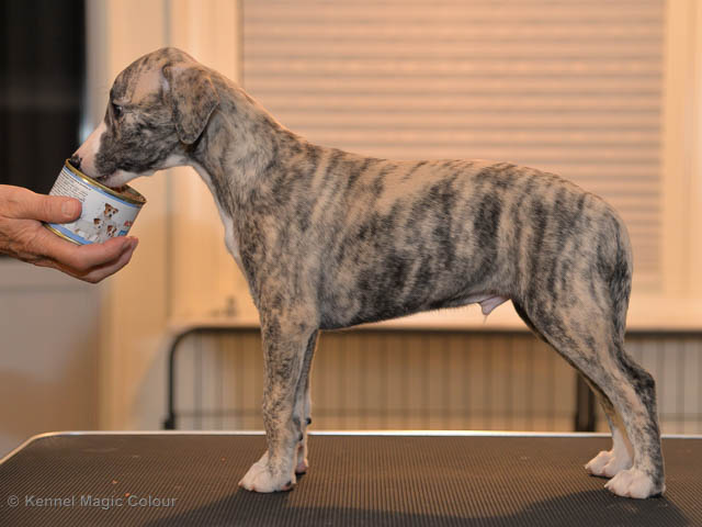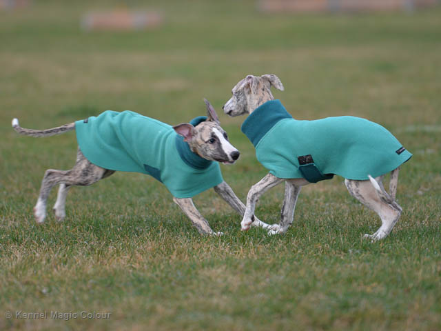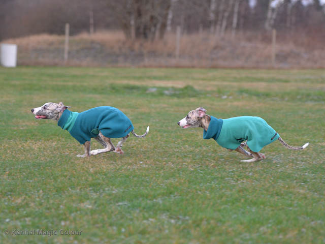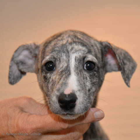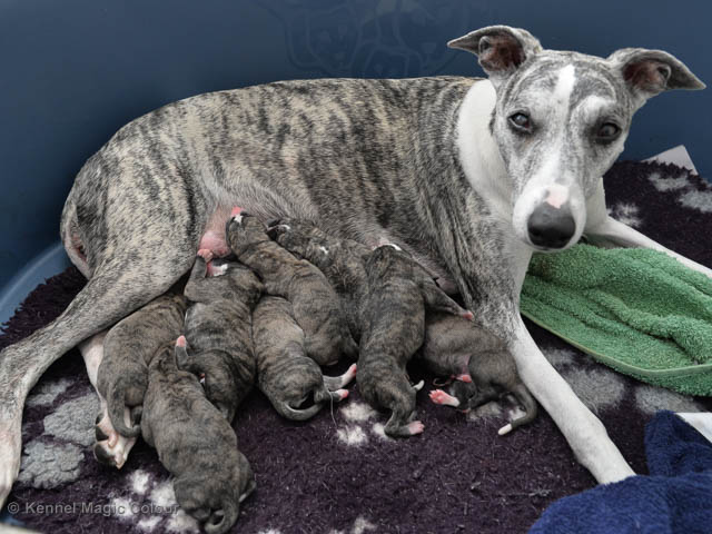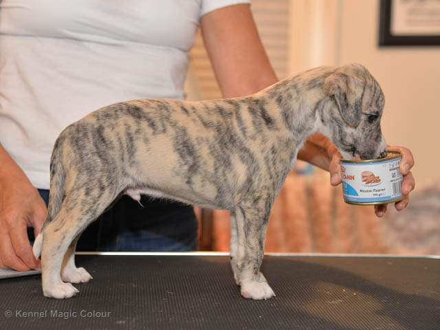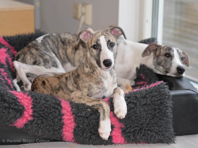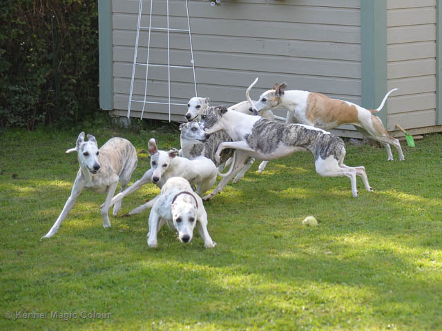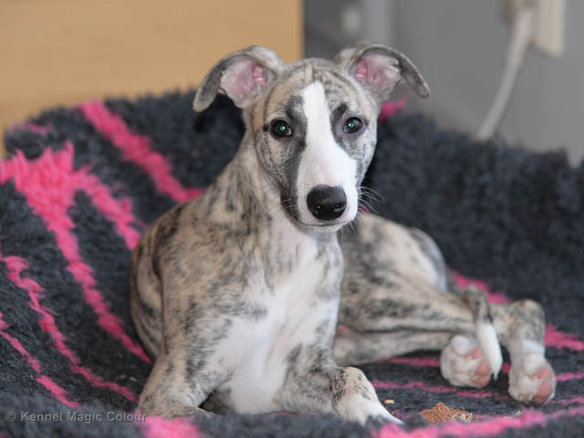 2019-01-21 Valparna 5 veckor gamla Nu är det riktigt små mini-whippets som springer runt i valphagen. De börjar bli hyfsat stabila och kan röra sig med ganska hög fart. Deras ögon är inte färdigutvecklat, så de springer ju ibland in i ting som är i deras väg. Maten är nu till stor del hundfoder och mjölkbaren är endast öppen korta stunder. Det är tydligt det gör ont på mamma Chanel när de diar, men hon gillar fortfarande att ligga tillsammans med de små. De är inne i en period med ”höjdskräck”, så det är inte helt lätt att fota dem – bilderna på dem gör det inte helt rättvisa… Magic Colour North Sail (Kenzo) Magic Colour Latin Sail (Josh) Magic Colour Sail For Gold (Kirin) Magic Colour White Sail (Kenny) Magic Colour Sail By The Stars (Pippi) Magic Colour Blond Sail (Bella)