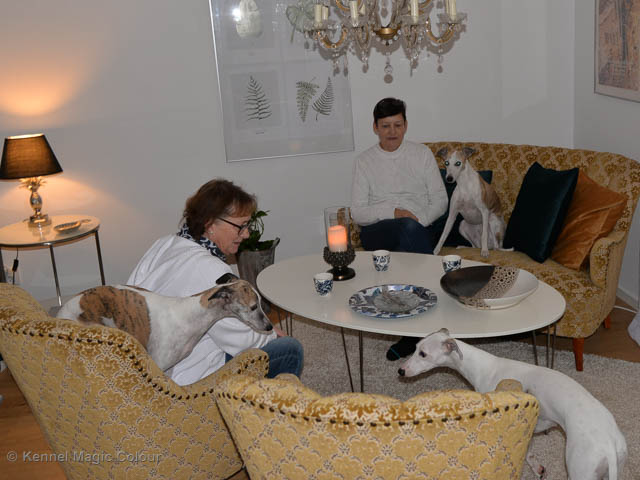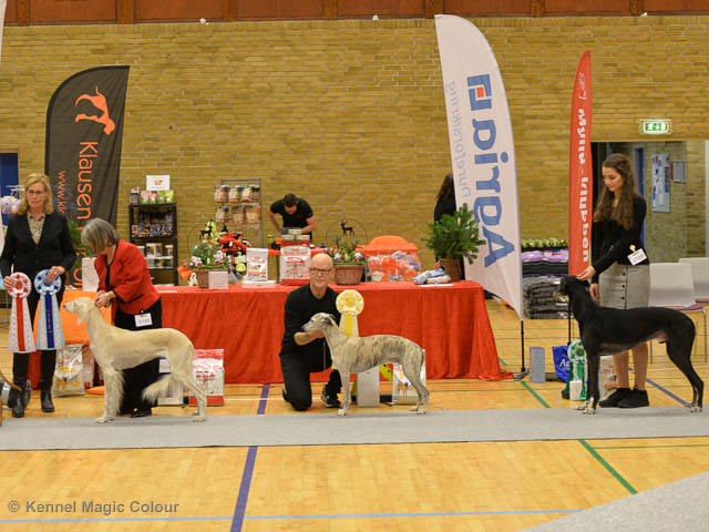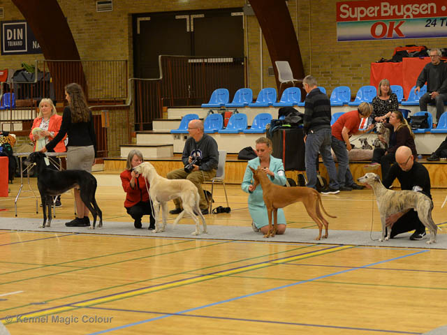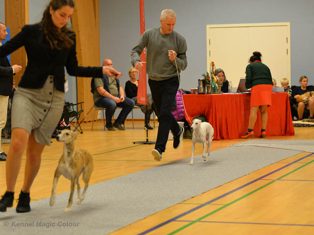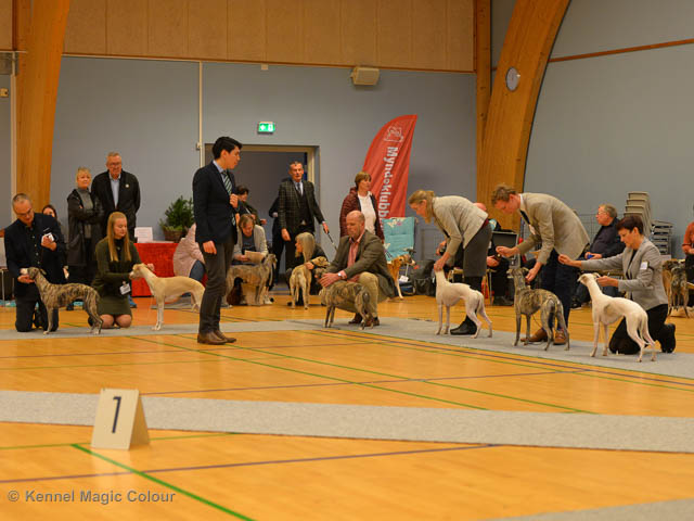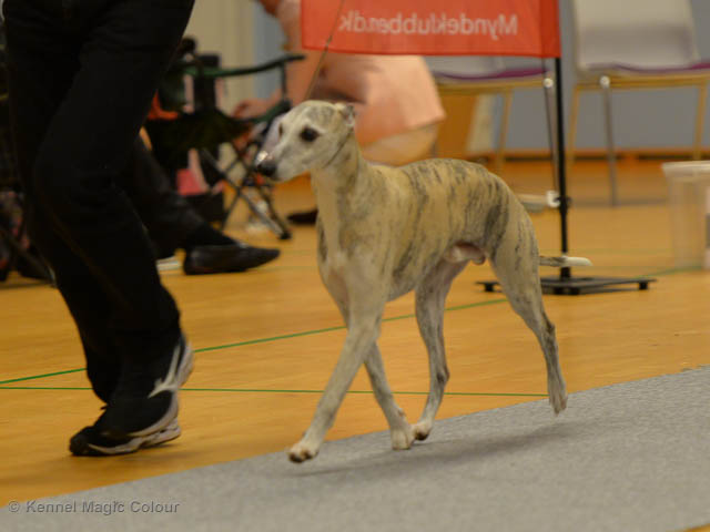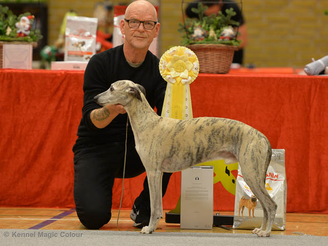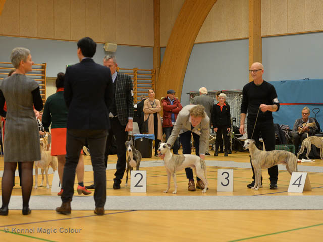 2019-11-23 Danska Myndeklubbens julutställning i Köge Idag har vi varit på danska Myndeklubbens julutställning. Supertrevligt och med jättefina priser som vanligt. Tack för en välorganiserad utställning. Totalt var det anmäld 80 whippets och domare var Simon Tien Hansen från Norge. Från MC deltog Boss (MC Sheldons Theory), Leffe (Ch MC Cyber Life), Bella (MC Blond Sail), Smukke (MC Wondder Babe) och Candy (DKJUCh MC Sugar Candy). Stort grattis Leffe, som var dagens stjärna och så nära det var för både Bella och Candy. Som alltid var det trevlig stämning i MC-gänget. Detta var årets sista utställning i 2019. Deltagande hundars resultatMagic Colour Sugar Candy (Candy) EXC-1, CK, BT4, reserv certMagic Colour Blond Sail (Bella) EXC-2, CK, reserv junior certMagic Colour Sheldons Theory (Boss) EXCMagic Colour Cyber Life (Leffe) EXC -1, CK, BH4, BIR och BIS-3 veteranMagic Colour Wonder Babe (Smukke) EXCUppfödergrupp/Breeder group 3:a med HP Boss Leffe Bella Smukke Candy Uppfödergrupp