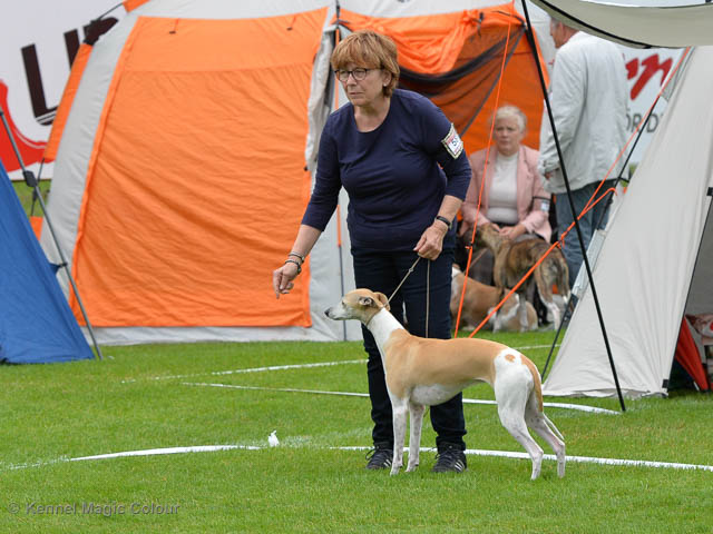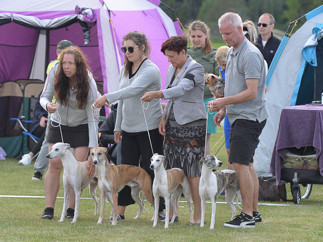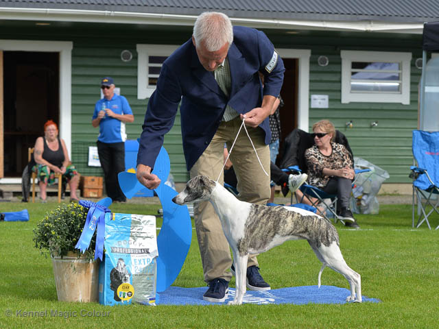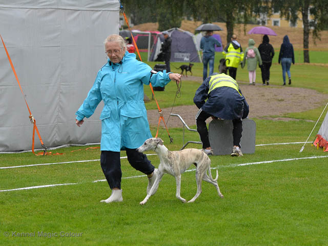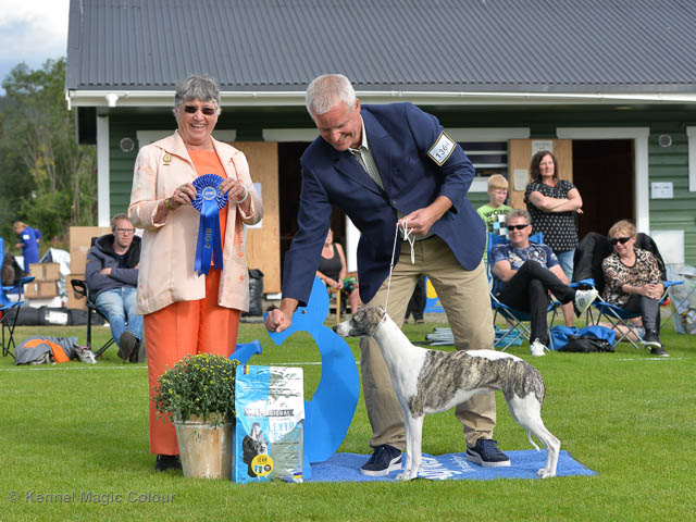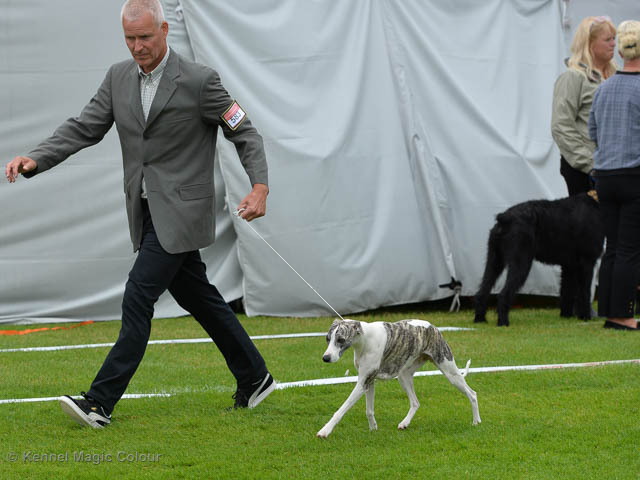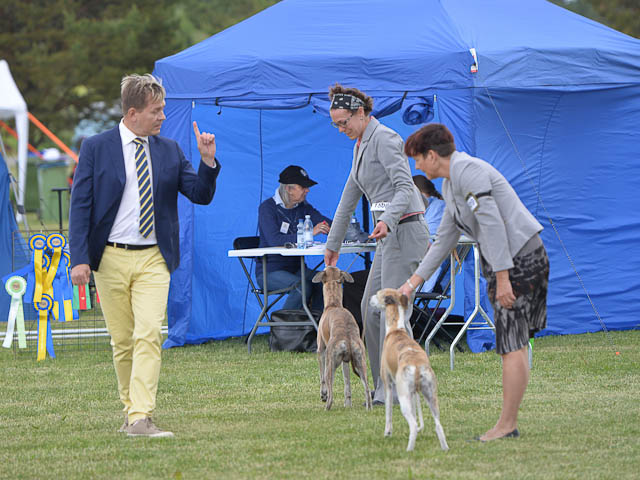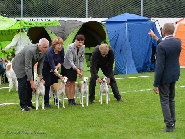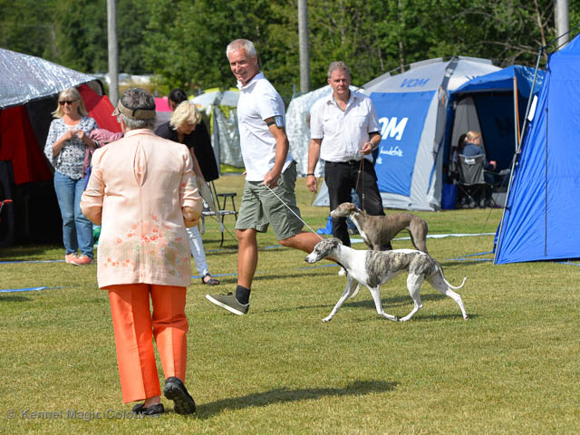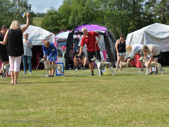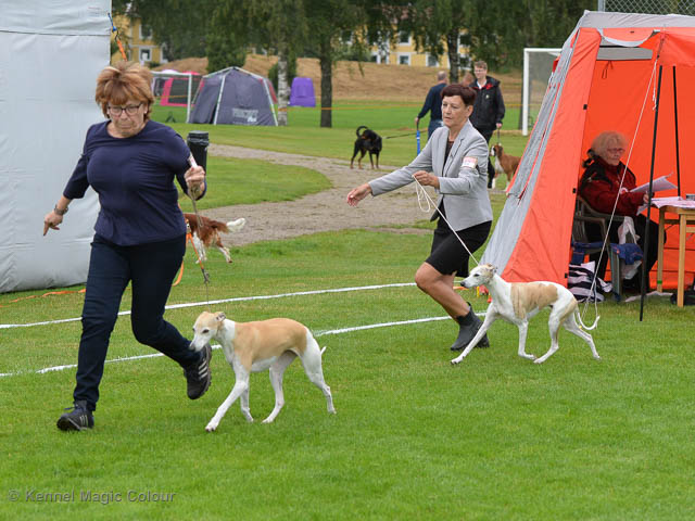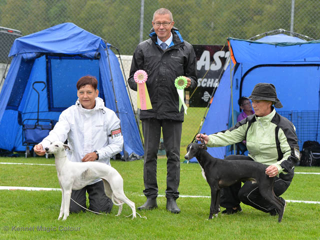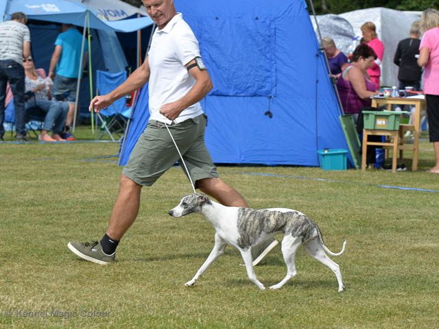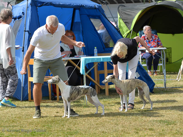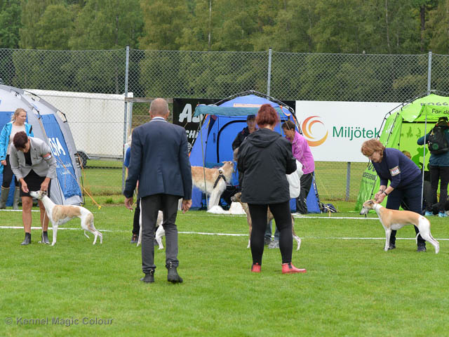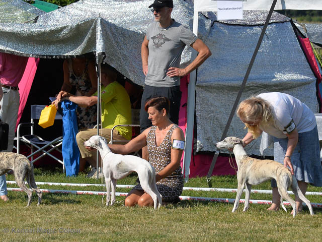 2019-08-10 NDS i Askersund Idag har vi varit på National Dog Show (NDS) i Askersund. Totalt var det anmäld 34 whippets och domare var Hans Almgren från Sverige. Från MC deltog Pippi – Magic Colour Sail By The Stars, Bella – Magic Colour Blond Sail, Viking – Magic Colour Captain Tyler, Lovis – magic Colour Love Me Cowboy, Scarlet – Magic Colour Scarlet Tyler och Candy – magic Colour Sugar Candy. Vi hade inte lika mycket tur med vädret, som i Svenstavik helgen innan. Det var ihållande regn när valparna och Vicke var på och sedan var det uppehåll när tjejerna skulle på. Vilken dag det blev för MC – alla sex hundar fick fina kritiker. Stämningen i MC-gänget var i topp och helt opåverkat av det dåliga vädret. Stort tack för all hjälp med hundvakt, fotande och för ni ställer upp och gör det möjligt för oss. Ett extra tack till Vibeke och Henning som stannade kvar till finalerna i det dåliga vädret. Deltagande hundars resultatMagic Colour Blond Sail (Bella) HP-1, BIR-Valp, oplacerad i BIS-finalenMagic Colour Captain Tyler (Viking) EXC-3Magic Colour Love Me Cowboy (Lovis) EXC-4Magic Colour Scarlet Tyler (Scarlet) EXC-1, CQ, BF-1, CAC, BOSMagic Colour Sail By The Stars (Pippi) HP-2Uppfödergrupp/Breeder group HP-1 BIR Team Magic Colour Bella Pippi Viking Lovis Scarlet Candy