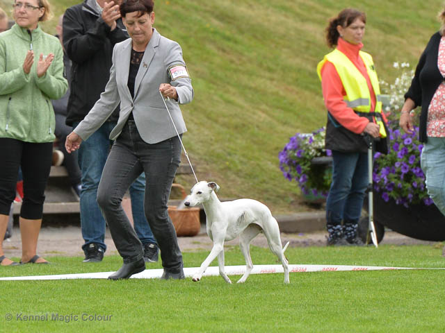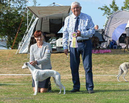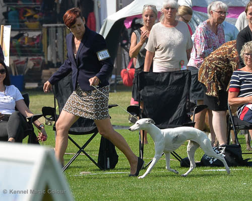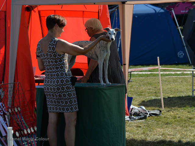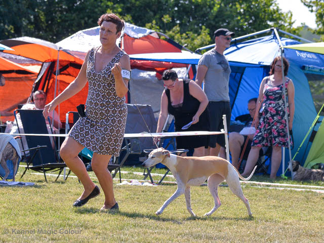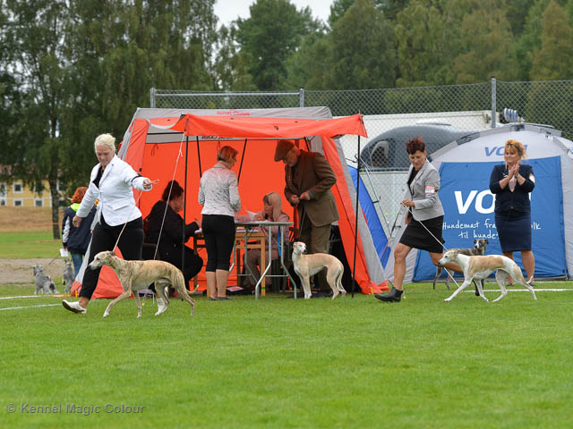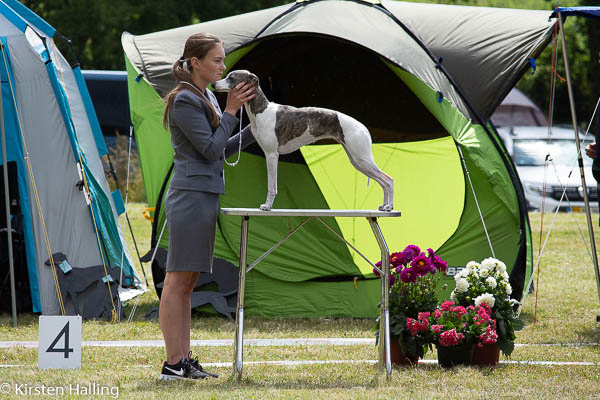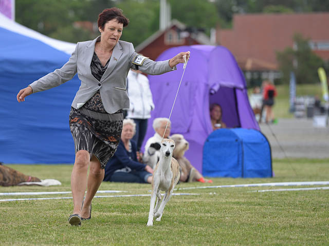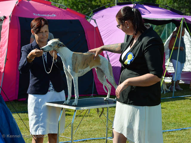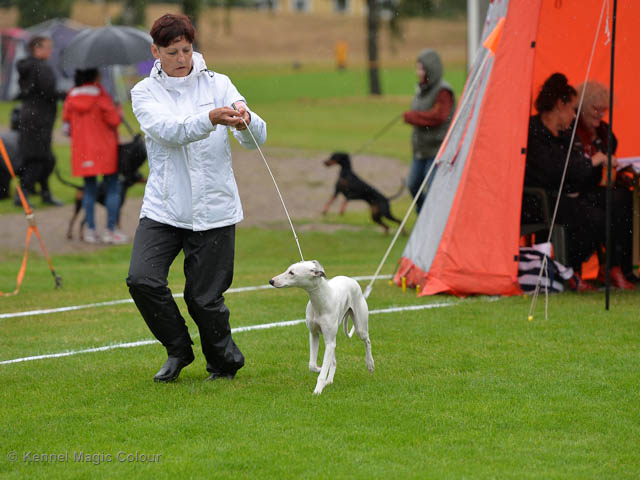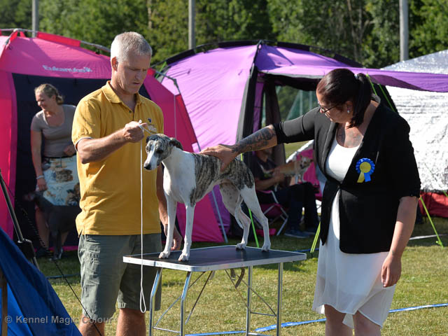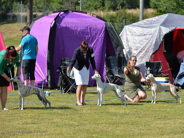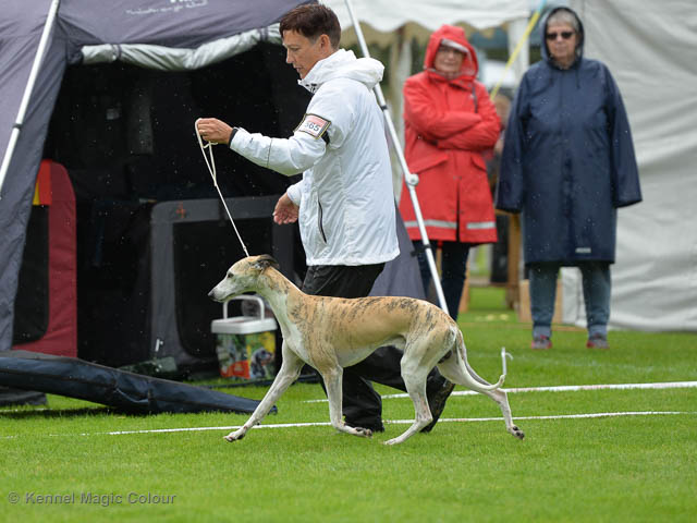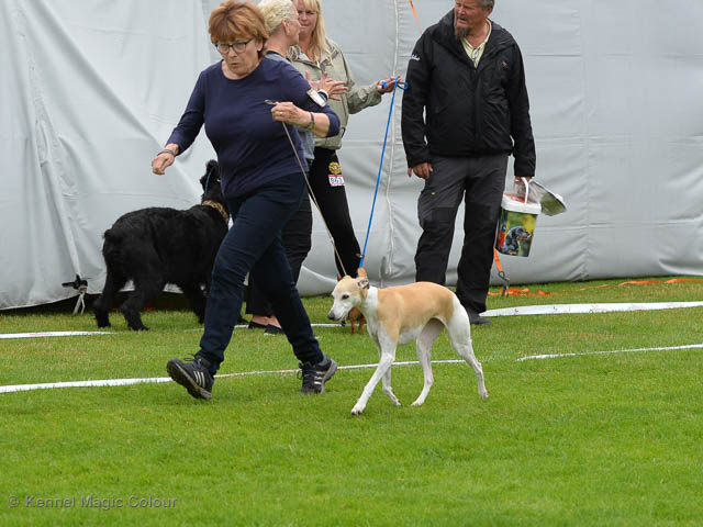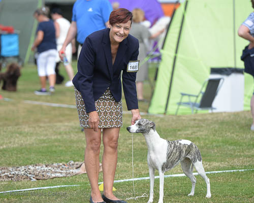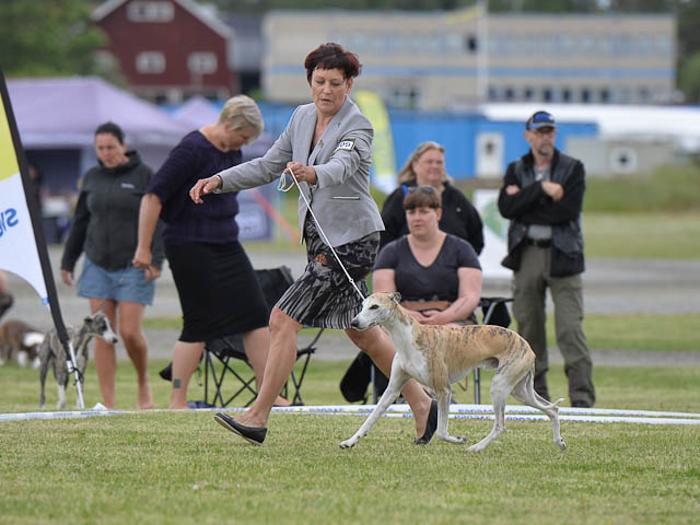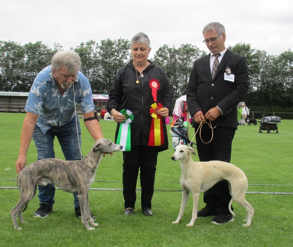 2019-08-10 NDS i Askersund Idag har vi varit på National Dog Show (NDS) i Askersund. Totalt var det anmäld 34 whippets och domare var Hans Almgren från Sverige. Från MC deltog Pippi – Magic Colour Sail By The Stars, Bella – Magic Colour Blond Sail, Viking – Magic Colour Captain Tyler, Lovis – magic Colour Love Me Cowboy, Scarlet – Magic Colour Scarlet Tyler och Candy – magic Colour Sugar Candy. Vi hade inte lika mycket tur med vädret, som i Svenstavik helgen innan. Det var ihållande regn när valparna och Vicke var på och sedan var det uppehåll när tjejerna skulle på. Vilken dag det blev för MC – alla sex hundar fick fina kritiker. Stämningen i MC-gänget var i topp och helt opåverkat av det dåliga vädret. Stort tack för all hjälp med hundvakt, fotande och för ni ställer upp och gör det möjligt för oss. Ett extra tack till Vibeke och Henning som stannade kvar till finalerna i det dåliga vädret. Deltagande hundars resultatMagic Colour Blond Sail (Bella) HP-1, BIR-Valp, oplacerad i BIS-finalenMagic Colour Captain Tyler (Viking) EXC-3Magic Colour Love Me Cowboy (Lovis) EXC-4Magic Colour Scarlet Tyler (Scarlet) EXC-1, CQ, BF-1, CAC, BOSMagic Colour Sail By The Stars (Pippi) HP-2Uppfödergrupp/Breeder group HP-1 BIR Team Magic Colour Bella Pippi Viking Lovis Scarlet Candy