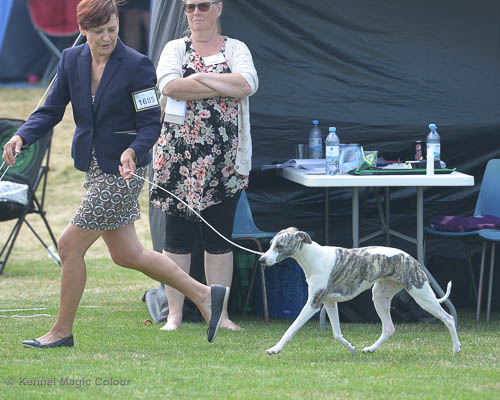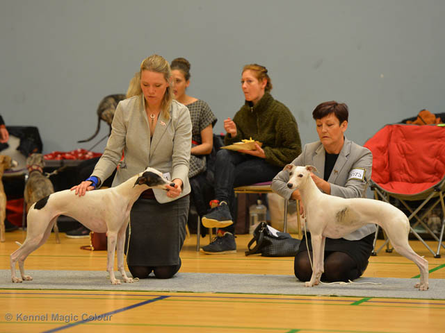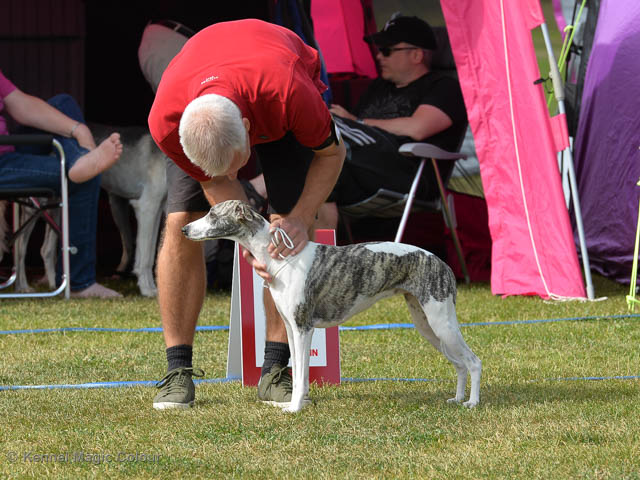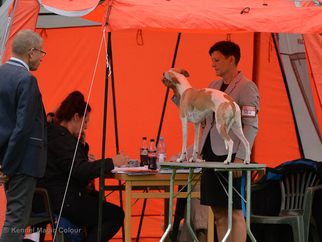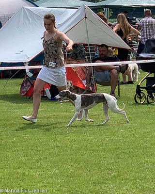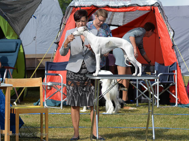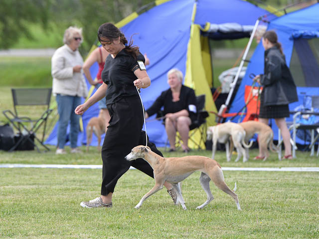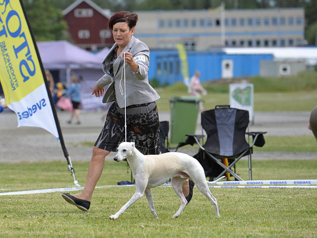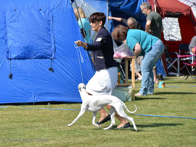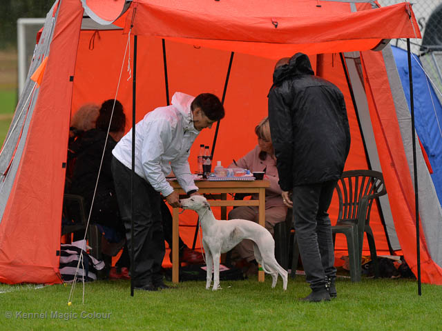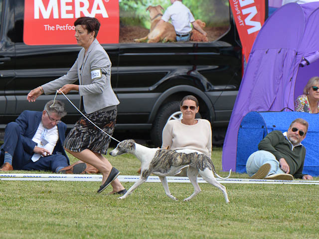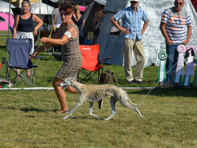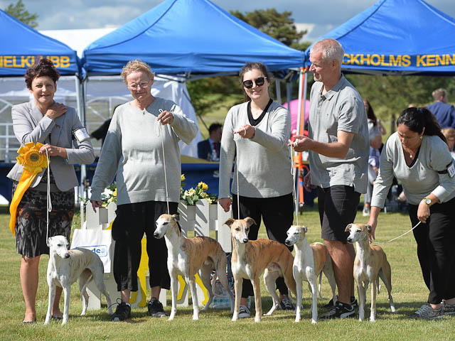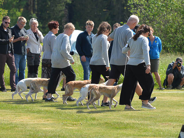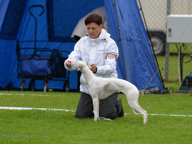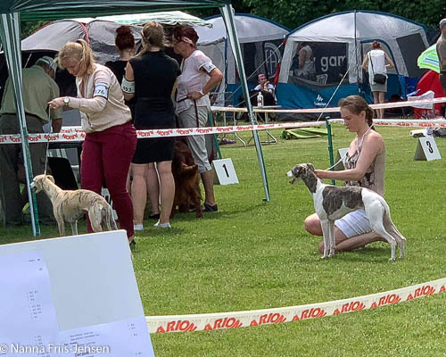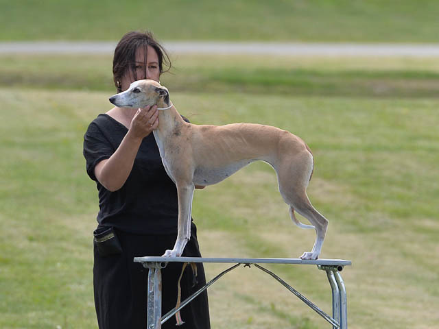 2019-08-10 NDS i Askersund Idag har vi varit på National Dog Show (NDS) i Askersund. Totalt var det anmäld 34 whippets och domare var Hans Almgren från Sverige. Från MC deltog Pippi – Magic Colour Sail By The Stars, Bella – Magic Colour Blond Sail, Viking – Magic Colour Captain Tyler, Lovis – magic Colour Love Me Cowboy, Scarlet – Magic Colour Scarlet Tyler och Candy – magic Colour Sugar Candy. Vi hade inte lika mycket tur med vädret, som i Svenstavik helgen innan. Det var ihållande regn när valparna och Vicke var på och sedan var det uppehåll när tjejerna skulle på. Vilken dag det blev för MC – alla sex hundar fick fina kritiker. Stämningen i MC-gänget var i topp och helt opåverkat av det dåliga vädret. Stort tack för all hjälp med hundvakt, fotande och för ni ställer upp och gör det möjligt för oss. Ett extra tack till Vibeke och Henning som stannade kvar till finalerna i det dåliga vädret. Deltagande hundars resultatMagic Colour Blond Sail (Bella) HP-1, BIR-Valp, oplacerad i BIS-finalenMagic Colour Captain Tyler (Viking) EXC-3Magic Colour Love Me Cowboy (Lovis) EXC-4Magic Colour Scarlet Tyler (Scarlet) EXC-1, CQ, BF-1, CAC, BOSMagic Colour Sail By The Stars (Pippi) HP-2Uppfödergrupp/Breeder group HP-1 BIR Team Magic Colour Bella Pippi Viking Lovis Scarlet Candy