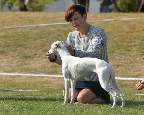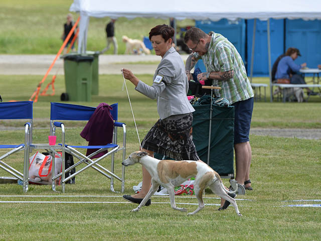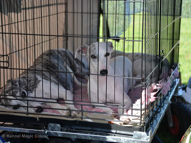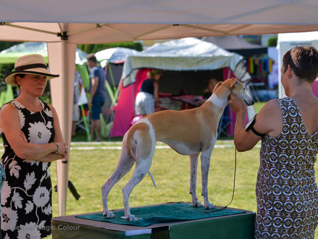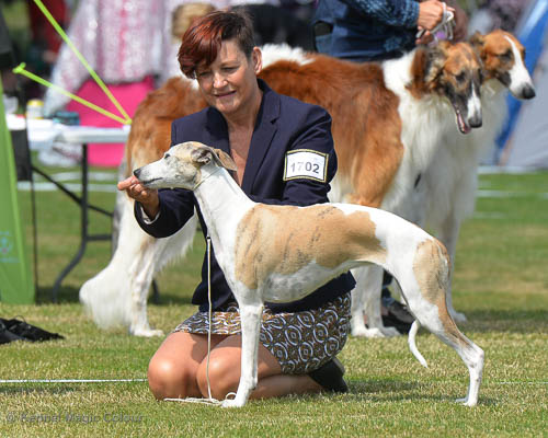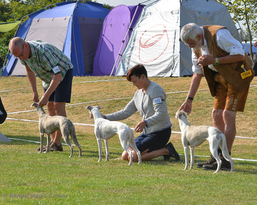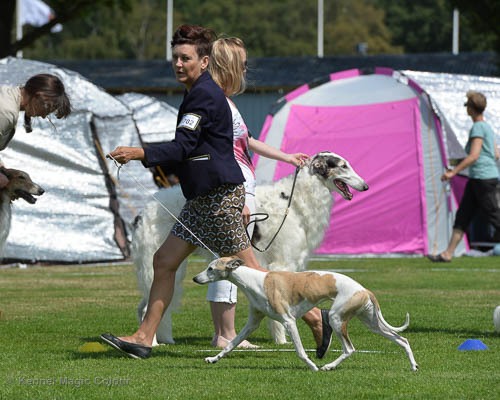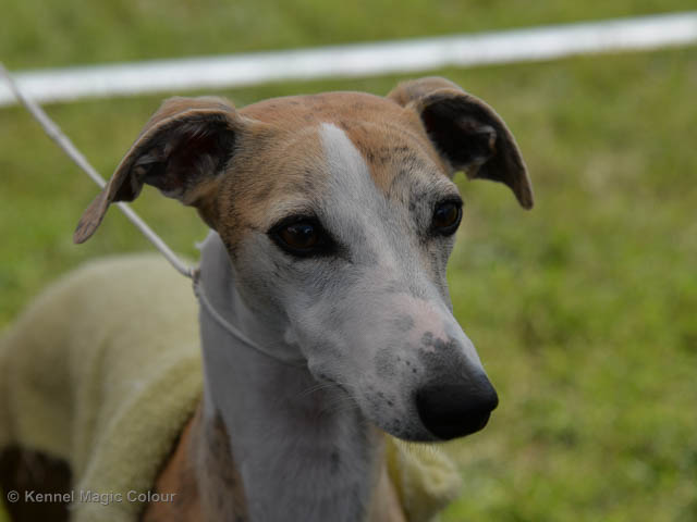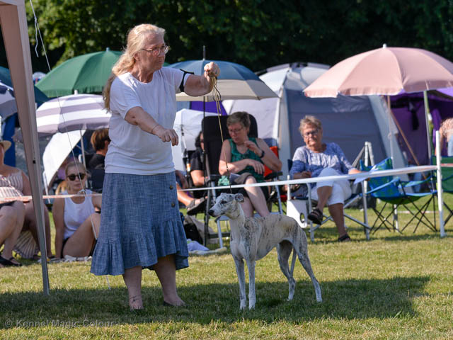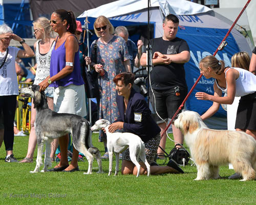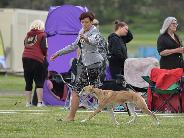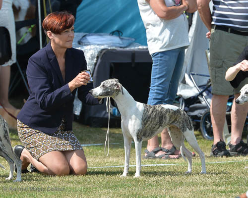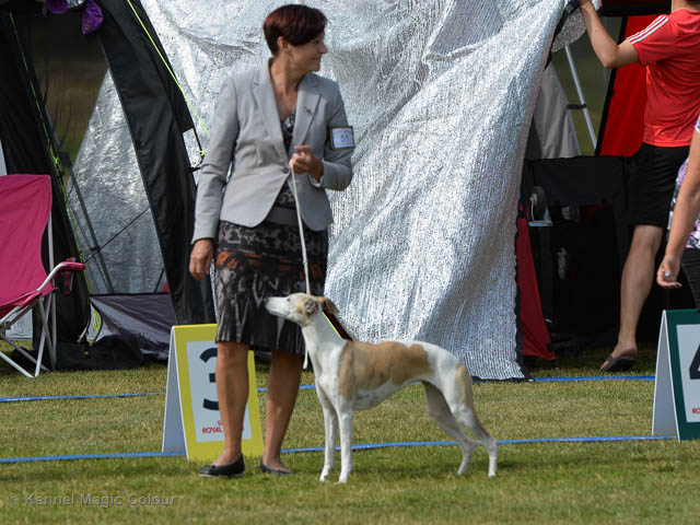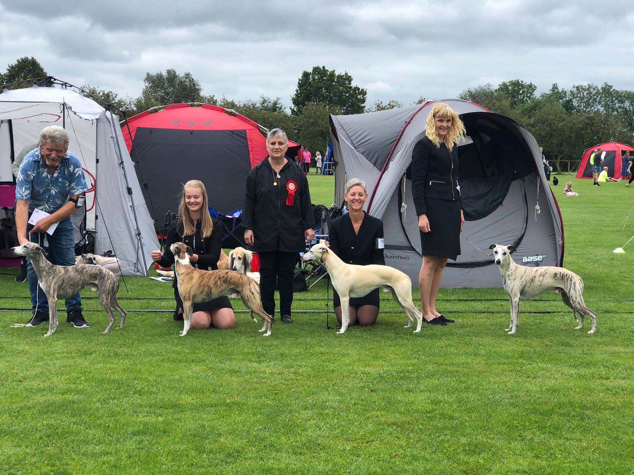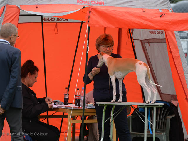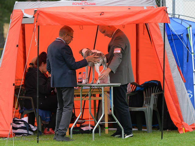 2019-08-10 NDS i Askersund Idag har vi varit på National Dog Show (NDS) i Askersund. Totalt var det anmäld 34 whippets och domare var Hans Almgren från Sverige. Från MC deltog Pippi – Magic Colour Sail By The Stars, Bella – Magic Colour Blond Sail, Viking – Magic Colour Captain Tyler, Lovis – magic Colour Love Me Cowboy, Scarlet – Magic Colour Scarlet Tyler och Candy – magic Colour Sugar Candy. Vi hade inte lika mycket tur med vädret, som i Svenstavik helgen innan. Det var ihållande regn när valparna och Vicke var på och sedan var det uppehåll när tjejerna skulle på. Vilken dag det blev för MC – alla sex hundar fick fina kritiker. Stämningen i MC-gänget var i topp och helt opåverkat av det dåliga vädret. Stort tack för all hjälp med hundvakt, fotande och för ni ställer upp och gör det möjligt för oss. Ett extra tack till Vibeke och Henning som stannade kvar till finalerna i det dåliga vädret. Deltagande hundars resultatMagic Colour Blond Sail (Bella) HP-1, BIR-Valp, oplacerad i BIS-finalenMagic Colour Captain Tyler (Viking) EXC-3Magic Colour Love Me Cowboy (Lovis) EXC-4Magic Colour Scarlet Tyler (Scarlet) EXC-1, CQ, BF-1, CAC, BOSMagic Colour Sail By The Stars (Pippi) HP-2Uppfödergrupp/Breeder group HP-1 BIR Team Magic Colour Bella Pippi Viking Lovis Scarlet Candy