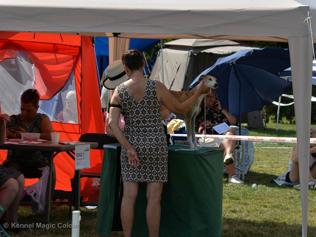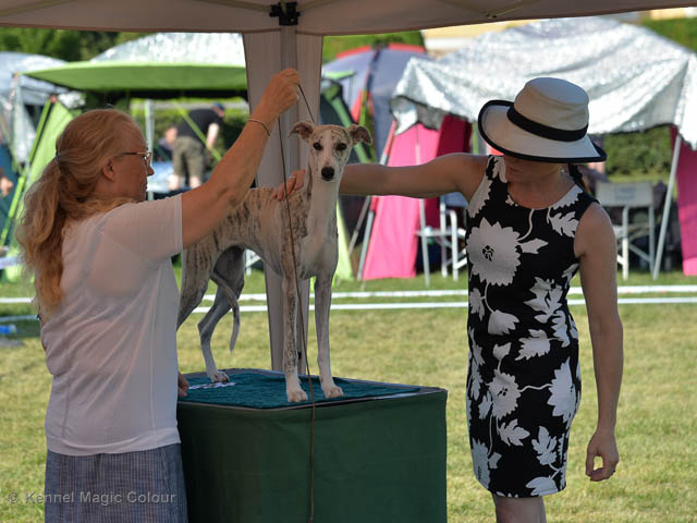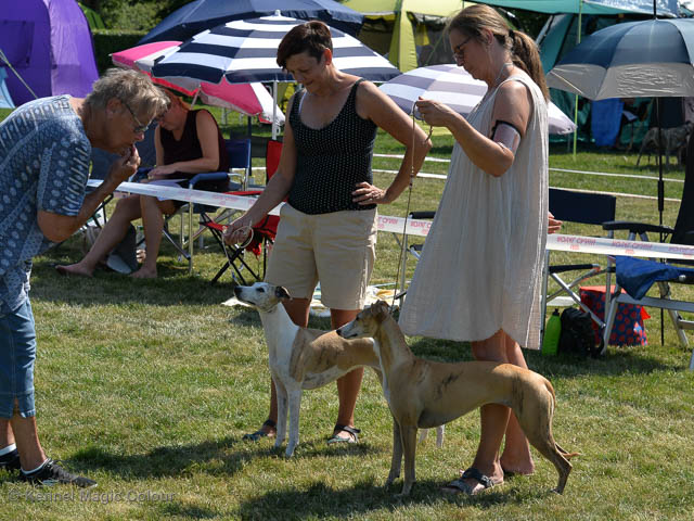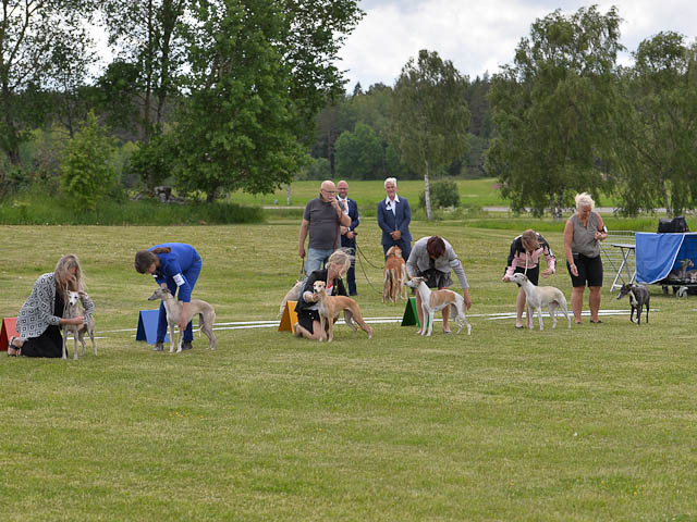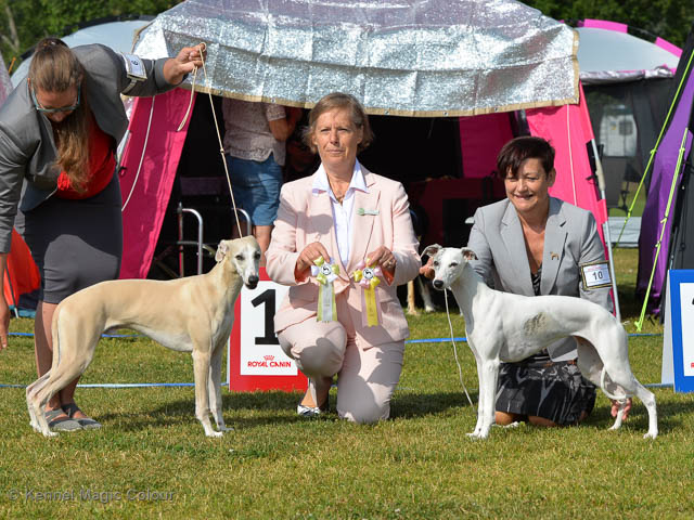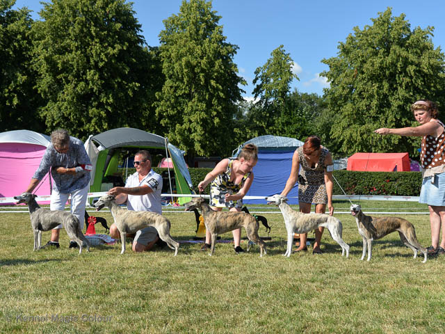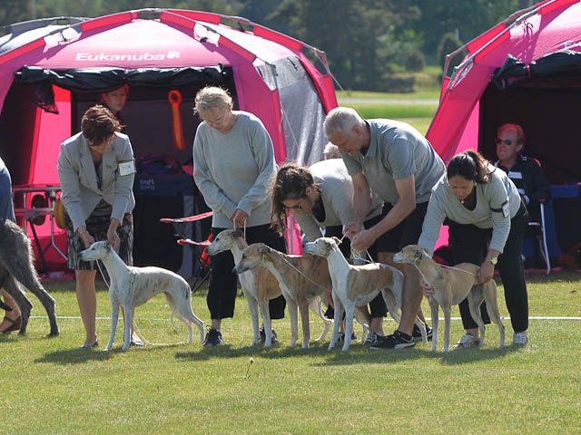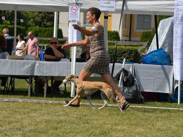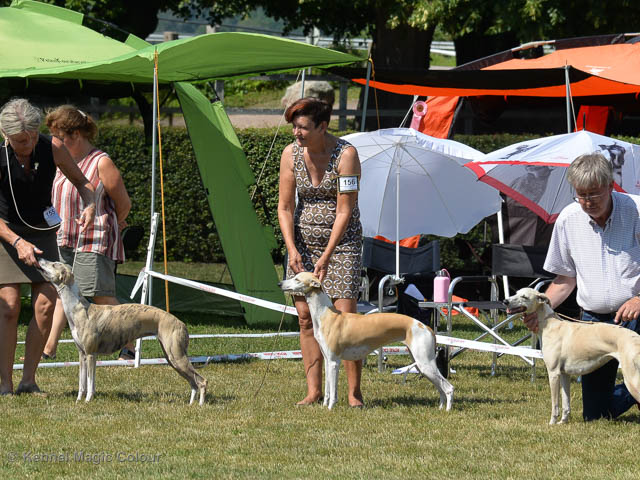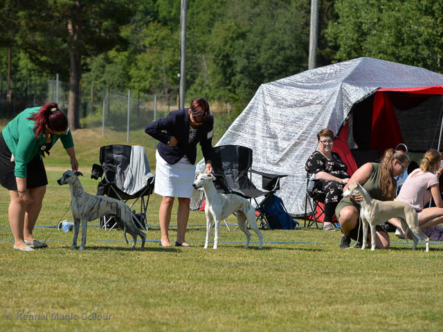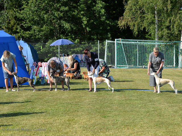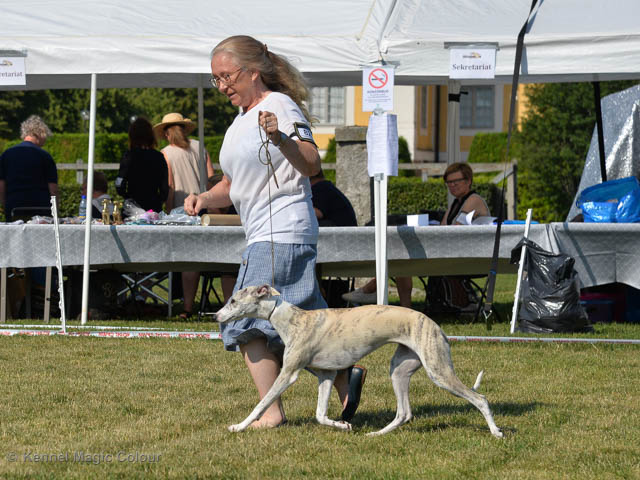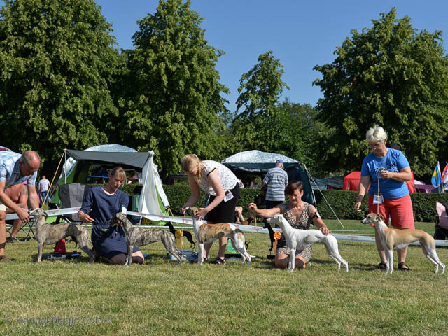 2019-07-27 SW:s Riksutställning på Strömsholm Slott Traditions enligt har vi varit på Svenska Whippetklubbens Riksutställning. Kennelmatte är med till att arrangera denna två-dagars utställning. I år var det mycket varmt alla dagar med en temperatur på över 30 grader. Totalt var 197 whippetar anmälda 68 hanar och 129 tikar. Domare var Joanne Boudreault från Canada, kennel Forgetmenot Whippets. Tikarna ställdes på lördagen. Från MC deltog Bella – Magic Colour Blod Sail, Pippi – Magic Colour Sail By The Stars, Indi – Magic Colour Lightning Streak, Lovis – Magic Colour Love Me Cowboy och Chili – Magic Colour Cyber Babe. I Bella och Pippis klass var det 12 valpar anmälda. I Indis klass var det 24 unghundar. I Lovis klass var det en mördande konkurrens med 34 tikar i öppen klass. Sist ut var Chili i seniorklass med 7 anmälda. Kennelmatte hade äran att få visa alla sånär Pippi, som visades så fint av sin matte. Alla tjejerna visade sig exemplariskt. I lunchpausen deltog Scarlet i skojkonkurrensen Bästa Huvud.Tack underbara valpköpare får att ni ställa upp. Ett särskilt tack till Vibeke och Henning som hjälpte till som funktionärer på utställningen – ni är guld värda. Deltagande hundars resultatMagic Colour Cyber Babe (Chili) EXC-4Magic Colour Blond Sail (Bella) EXC-4Magic Colour Love Me Cowboy (Lovis) EXCMagic Colour Lightning Streak (Indi) EXCMagic Colour Sail By The Stars (Pippi) EXC Team MC Bella Pippi Indi Lovis Chili