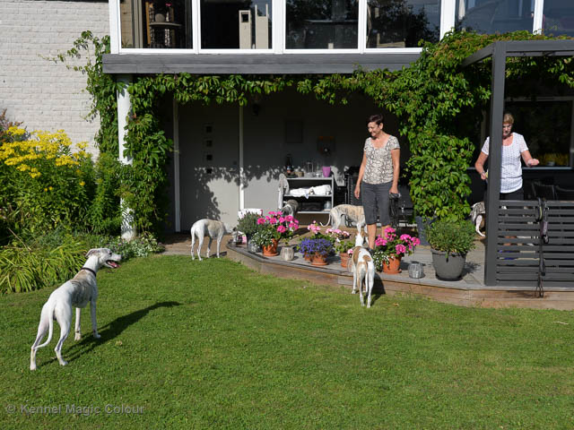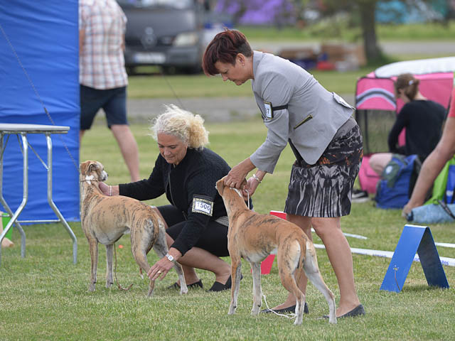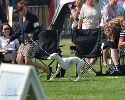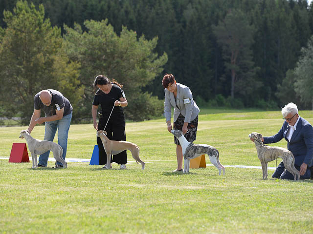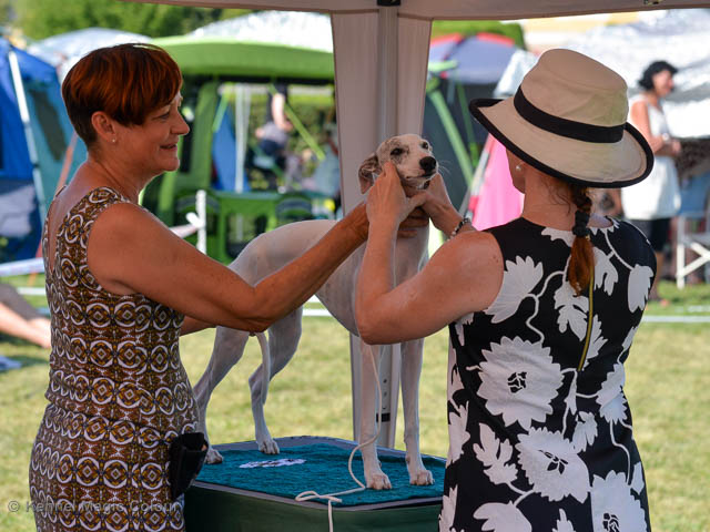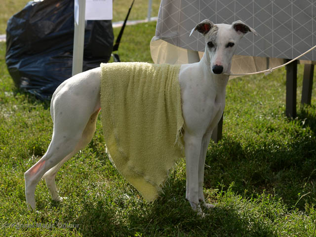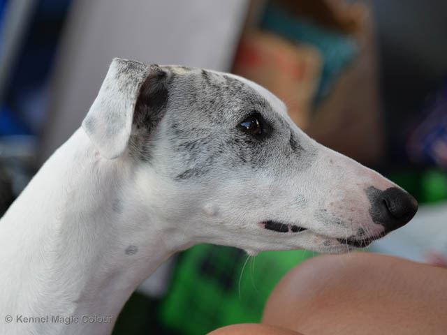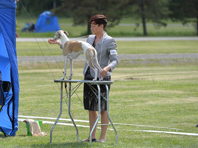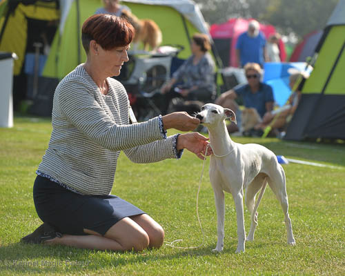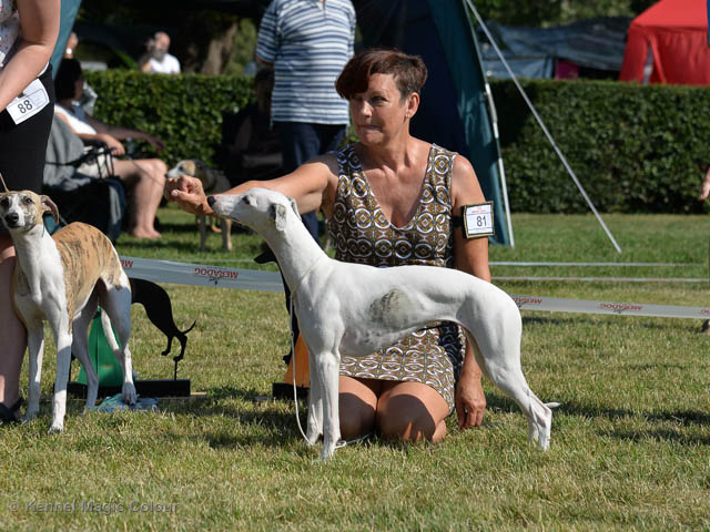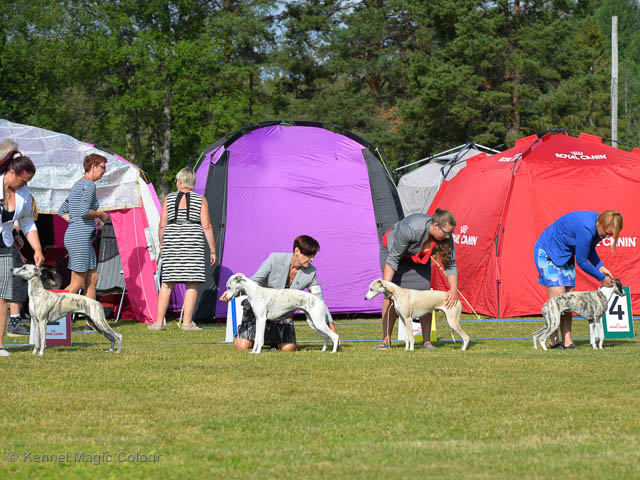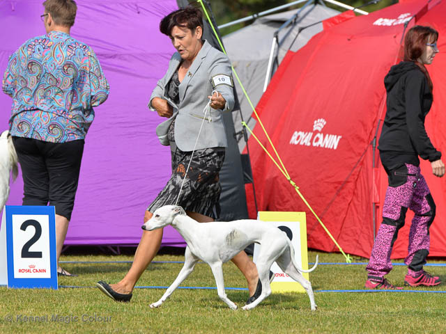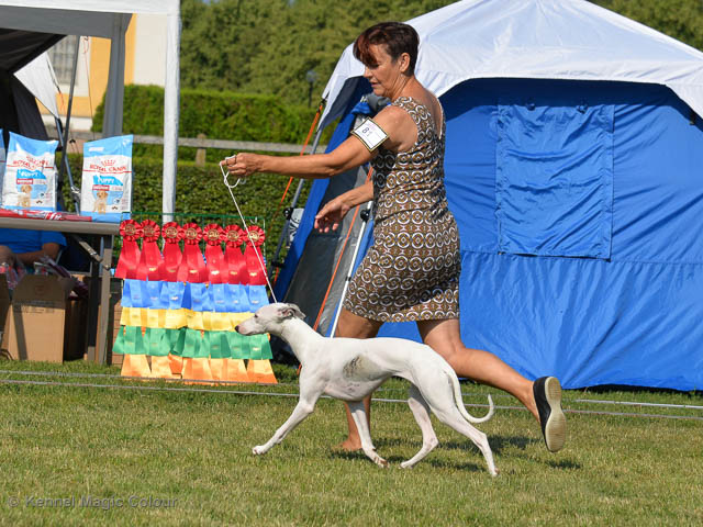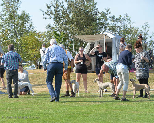 2019-07-27 SW:s Riksutställning på Strömsholm Slott Traditions enligt har vi varit på Svenska Whippetklubbens Riksutställning. Kennelmatte är med till att arrangera denna två-dagars utställning. I år var det mycket varmt alla dagar med en temperatur på över 30 grader. Totalt var 197 whippetar anmälda 68 hanar och 129 tikar. Domare var Joanne Boudreault från Canada, kennel Forgetmenot Whippets. Tikarna ställdes på lördagen. Från MC deltog Bella – Magic Colour Blod Sail, Pippi – Magic Colour Sail By The Stars, Indi – Magic Colour Lightning Streak, Lovis – Magic Colour Love Me Cowboy och Chili – Magic Colour Cyber Babe. I Bella och Pippis klass var det 12 valpar anmälda. I Indis klass var det 24 unghundar. I Lovis klass var det en mördande konkurrens med 34 tikar i öppen klass. Sist ut var Chili i seniorklass med 7 anmälda. Kennelmatte hade äran att få visa alla sånär Pippi, som visades så fint av sin matte. Alla tjejerna visade sig exemplariskt. I lunchpausen deltog Scarlet i skojkonkurrensen Bästa Huvud.Tack underbara valpköpare får att ni ställa upp. Ett särskilt tack till Vibeke och Henning som hjälpte till som funktionärer på utställningen – ni är guld värda. Deltagande hundars resultatMagic Colour Cyber Babe (Chili) EXC-4Magic Colour Blond Sail (Bella) EXC-4Magic Colour Love Me Cowboy (Lovis) EXCMagic Colour Lightning Streak (Indi) EXCMagic Colour Sail By The Stars (Pippi) EXC Team MC Bella Pippi Indi Lovis Chili