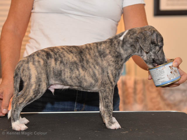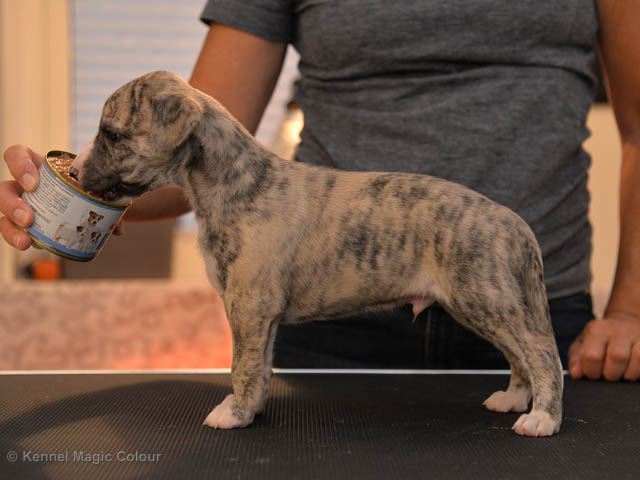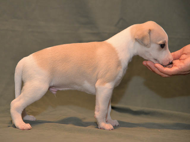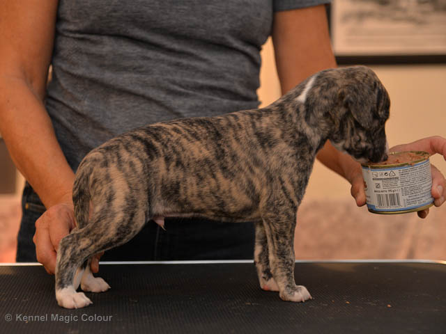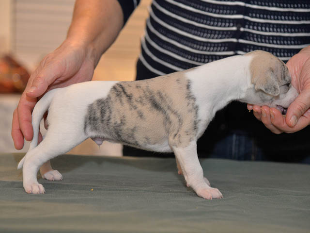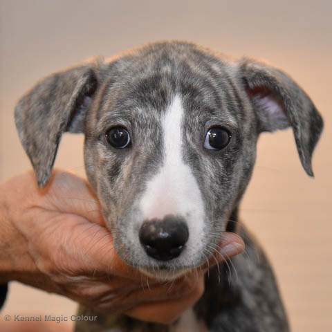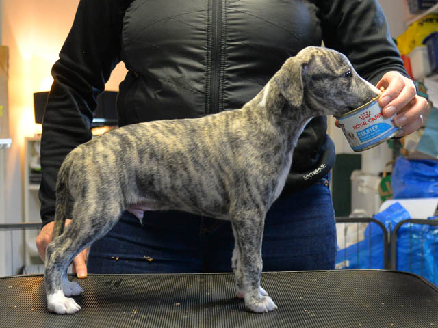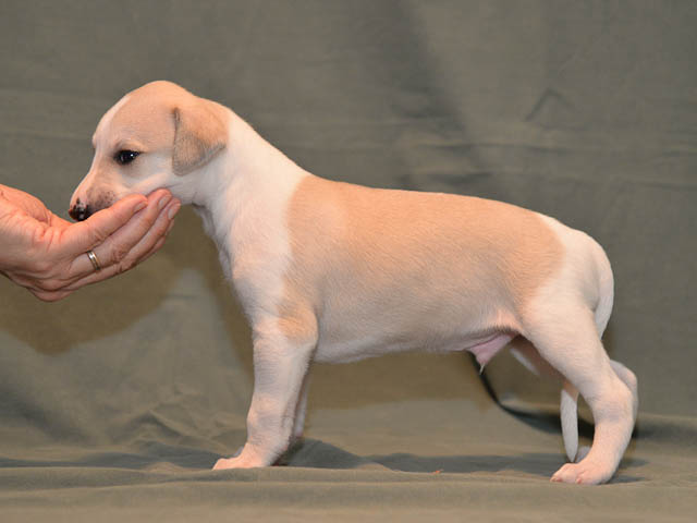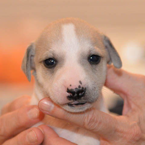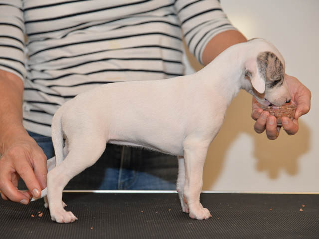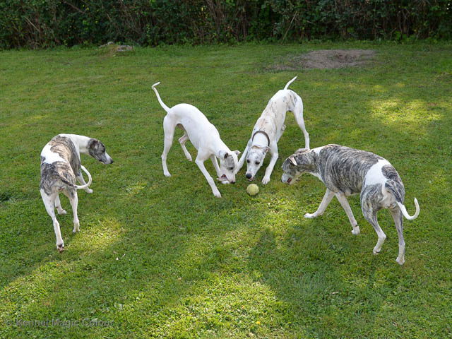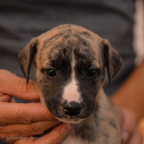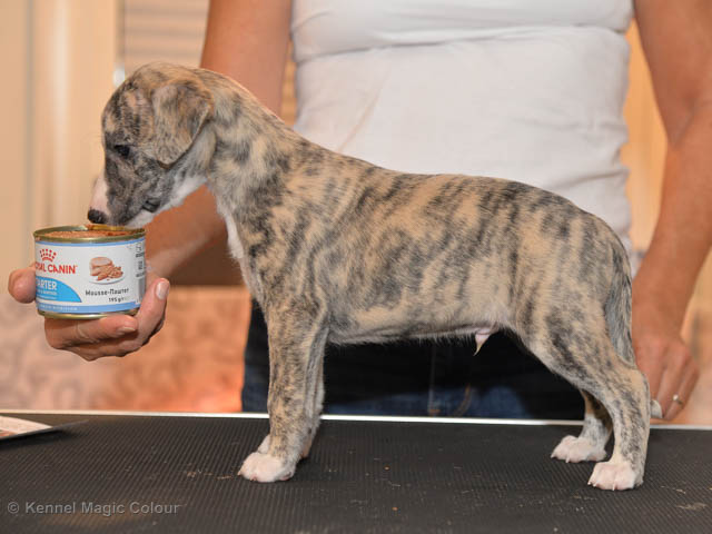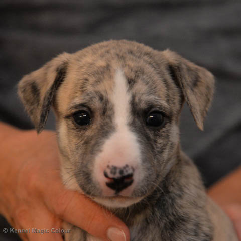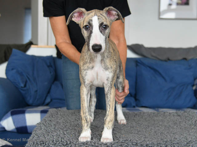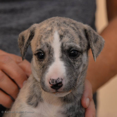 2019-10-15 Valparna 5 veckor gamla Fem veckor har gått och nu är det riktig små whippets som springer runt i valphagen. De både hör och ser bättra, och man kan nu inte längre smyga sig förbi dem utan att bli upptäck. Deras tänder är välutvecklat och sylvassa, vilket gör att mamma Sös nu inte längre vill dia dem – fast hon vill gärna vara tillsammans med dem. Under veckan har de varit utomhus ett antal gångar, och det tyckte de var roligt – att få springa lite längre sträcker var kul. De äter nu ”tort” valpfoder med en klick blöt-foder och har full koll på att själva dricka från vattenskålen. Lilla Bella (10 månader) börjar också bli favorit lek-tanten, och hon går gärna in i valphagen och ”fightas” lite med de små. Alla valpar och mamma Sös mår utmärkt. Magic Colour Sea Star Deep Love (Kosmo) Magic Colour Sea Star Dreamer (Harry) Magic Colour Sea Star High Noon (Elliot) Magic Colour Sea Star Jet Skye (Lotus) Magic Colour Sea Star Moody Blues (Hugo) Magic Colour Sea Star No Regrets (Floyd) Magic Colour Sea Star On The Line (Moltas) Magic Colour Sea Star So Sweet (Java)