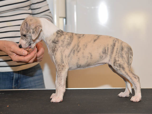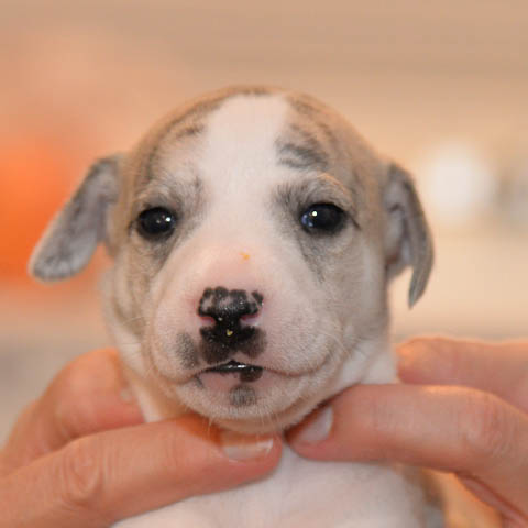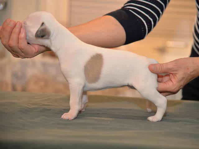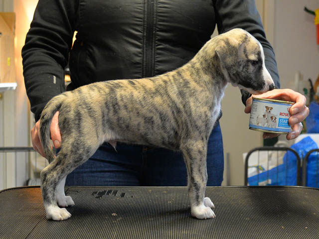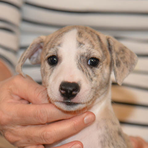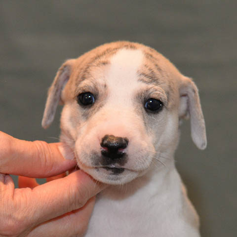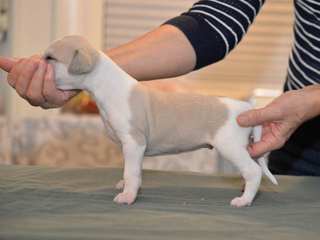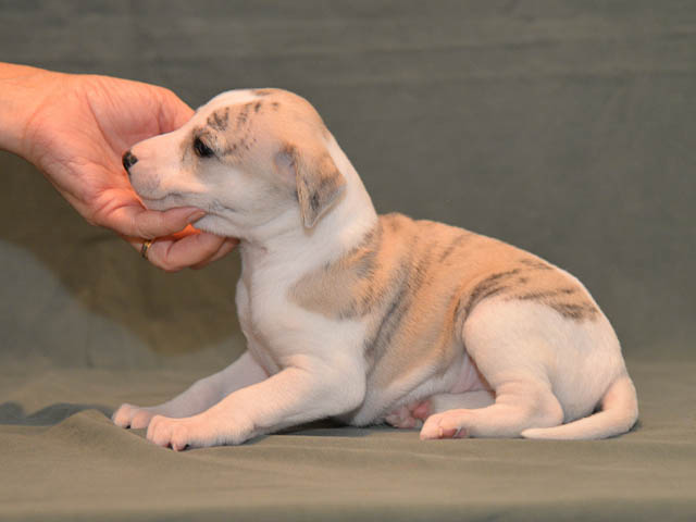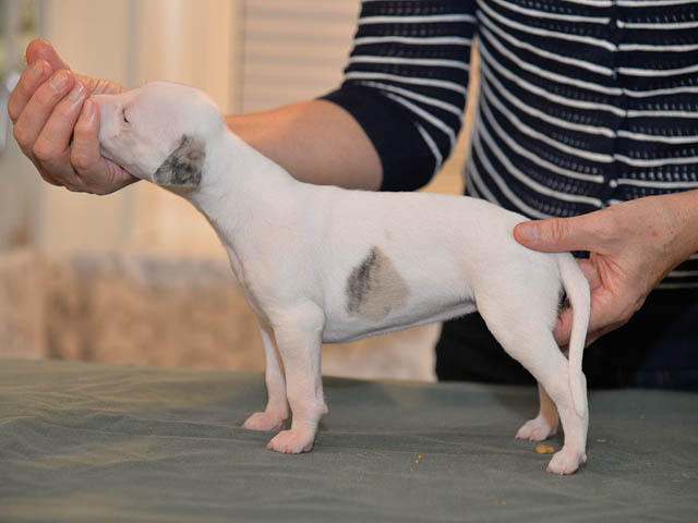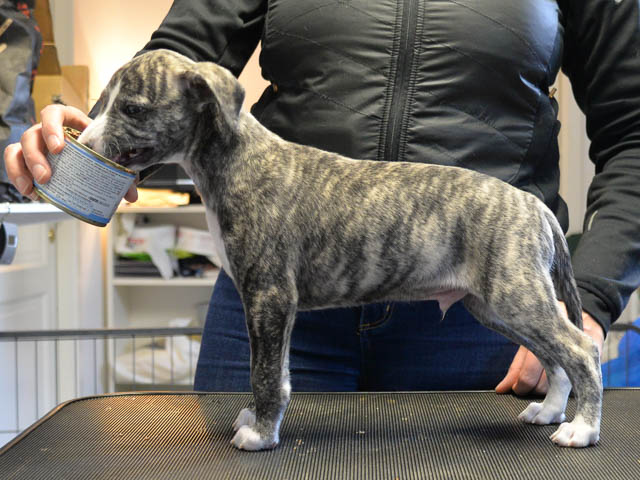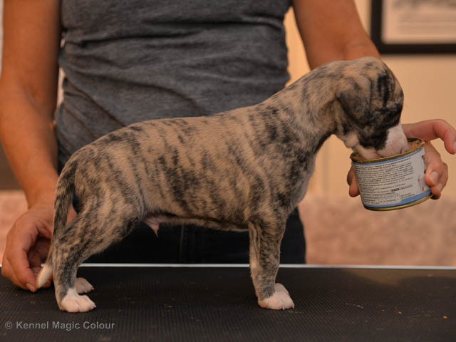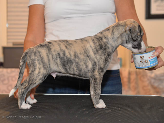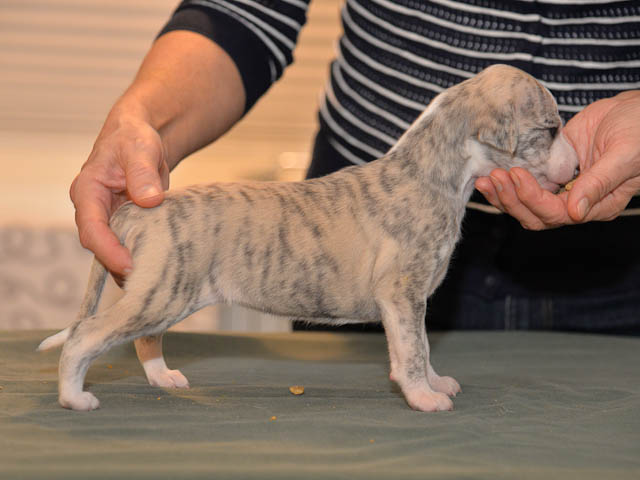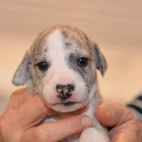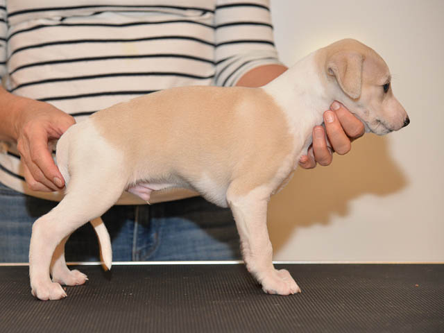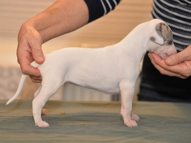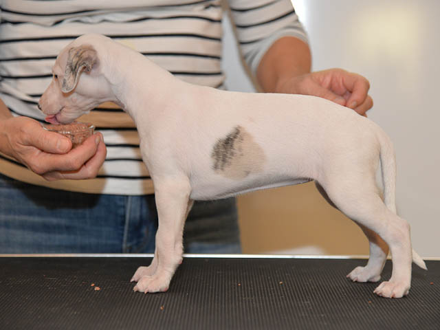 2019-10-15 Valparna 5 veckor gamla Fem veckor har gått och nu är det riktig små whippets som springer runt i valphagen. De både hör och ser bättra, och man kan nu inte längre smyga sig förbi dem utan att bli upptäck. Deras tänder är välutvecklat och sylvassa, vilket gör att mamma Sös nu inte längre vill dia dem – fast hon vill gärna vara tillsammans med dem. Under veckan har de varit utomhus ett antal gångar, och det tyckte de var roligt – att få springa lite längre sträcker var kul. De äter nu ”tort” valpfoder med en klick blöt-foder och har full koll på att själva dricka från vattenskålen. Lilla Bella (10 månader) börjar också bli favorit lek-tanten, och hon går gärna in i valphagen och ”fightas” lite med de små. Alla valpar och mamma Sös mår utmärkt. Magic Colour Sea Star Deep Love (Kosmo) Magic Colour Sea Star Dreamer (Harry) Magic Colour Sea Star High Noon (Elliot) Magic Colour Sea Star Jet Skye (Lotus) Magic Colour Sea Star Moody Blues (Hugo) Magic Colour Sea Star No Regrets (Floyd) Magic Colour Sea Star On The Line (Moltas) Magic Colour Sea Star So Sweet (Java)