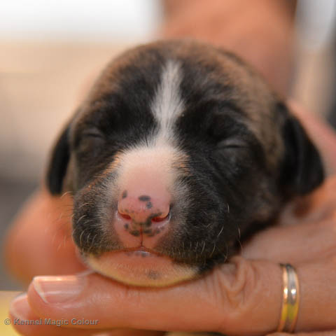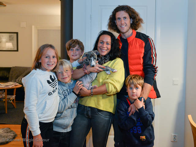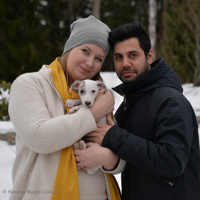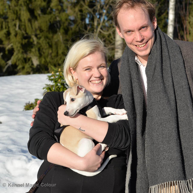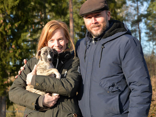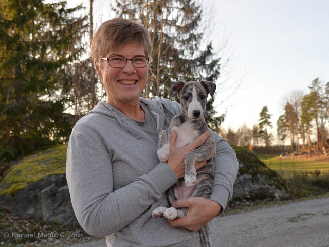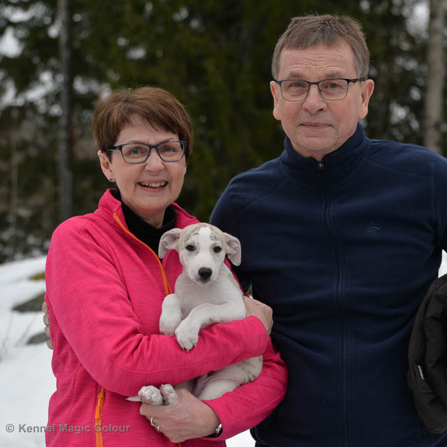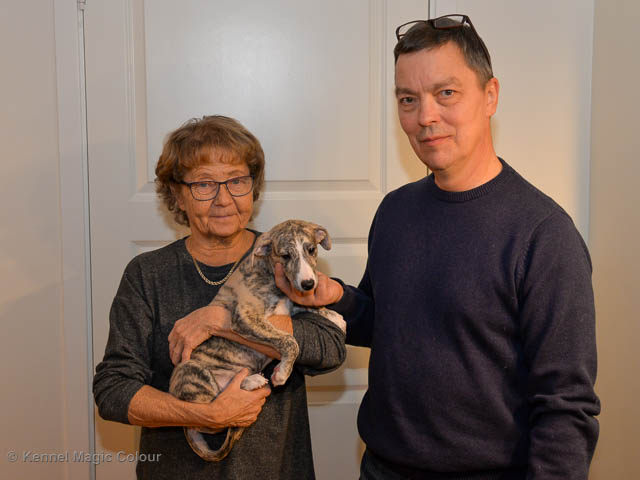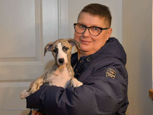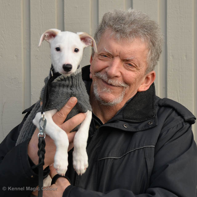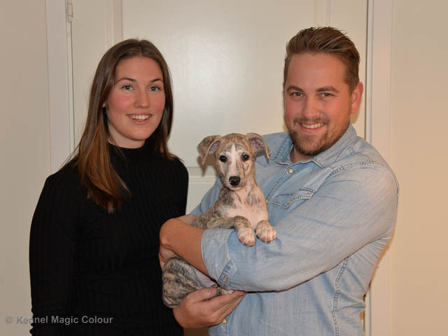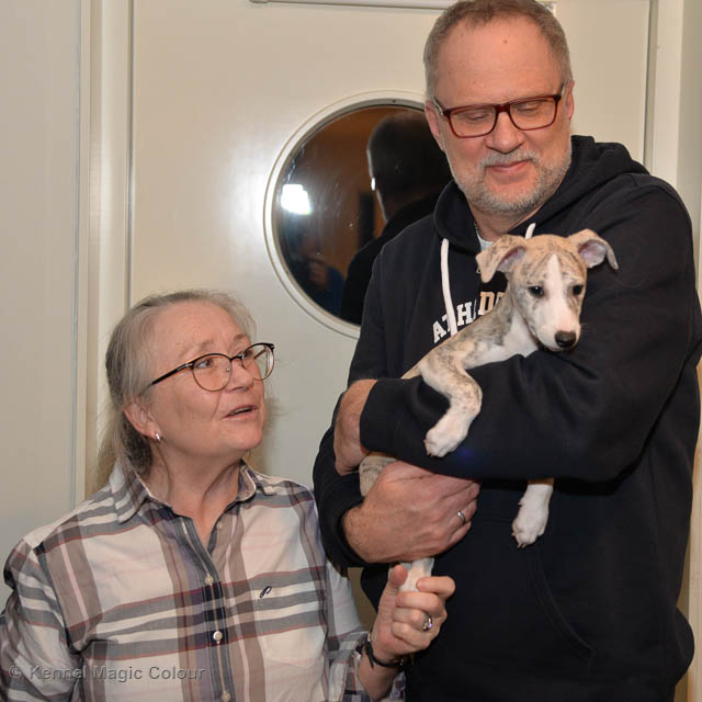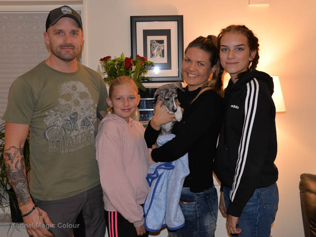2019-02-16 Sista valpen flyttar Så var det dags för sista valpen Kenzo – Magic Colour North Sail att flytta hem till Allan och hundkompisarna Joy, Billie och Boss i Danmark. Vi önskar Allan lycka till med lilla fina Kenzo, som nästan fick en vecka till med mamma och resten av flocken. Magic Colour North Sail (Kenzo)
